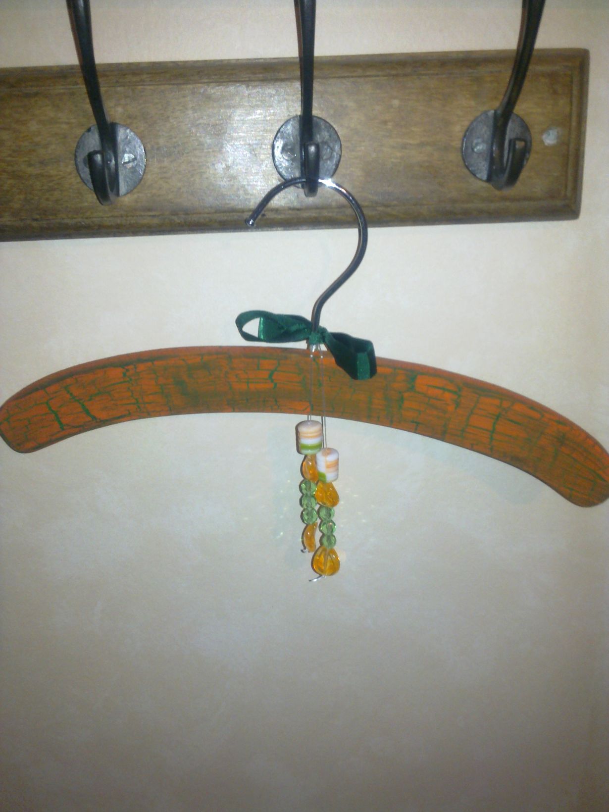 Tyttären maalaama ja koristelema henkari, jossa säilytän hänen 34v sitten saamaa mekkoa, jonka mummo kutoi 1 vuotis lahjaksi. Henkarin sain lahjaksi häneltä viime vuonna. Mekon otin pois kuvauksen ajaksi.