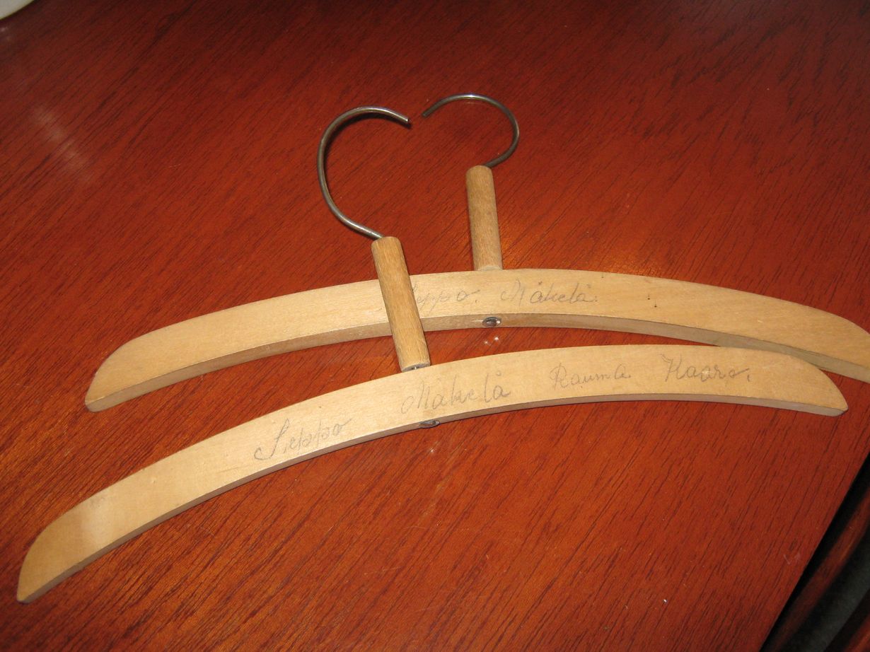 Kuvassa kaksi henkaria, jotka löysin meille perinnössä tulleista anopin tavaroista. Ne ovat kuuluneett Suomen kuuluisimmalle jääkiekkoerotuomari Seppo (Penalti) Mäkelälle. Ovat kaiketi hänen kansakoulun puukäsitöitään. Henkareissa lukee Seppo Mäkelä, Rauma, Kaaro. (Seppo on mieheni serkku)