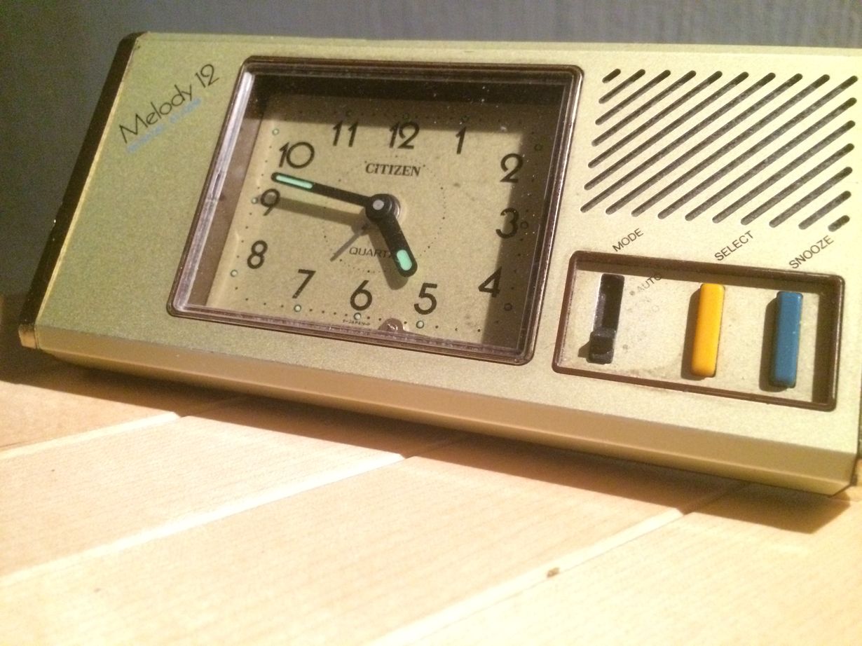 Eksältä sain tämän 12 melodisen herättäjän 1982. Kello käy ja kukkuu vieläkin, vain sekunttiviisari on luovuttanut, kuin myös kävi liittomme jo viisitoista vuotta sitten...