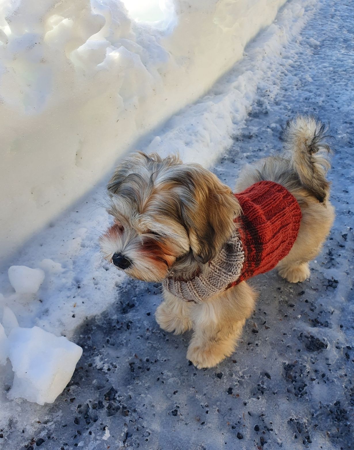 Herra Wilsson havannankoira saapui kotiimme 2 v sitten uudenvuoden rakettien räiskeessä. Oli kylmä ja kudoin hänelle nopeasti jämälangoista ekan villapaidan. Paita jäi nopeasti pieneksi ja sen pienuutta ihastellaan vielä aika ajoin. Sen jälkeen mummo on kutonut Wilssonille useita kauniita palmikkoneuleita, jotka olleet kovassa käytössä. Tämä muistona rakkaimpana...