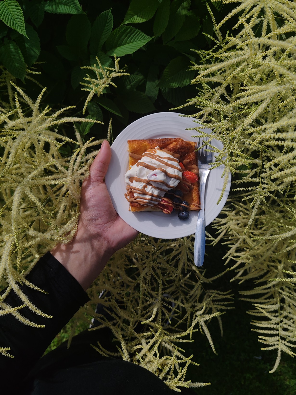 Hapanjuuri banaani-rahka pannukakku. Aloitin hapanjuuri reseptien kerryttämisen parivuotta sitte tosissani ja tämä oli yksi helpoimmista ja sitäkin herkullisimmista luomuksistani. Kuva oli nopeasti napsaistu auringonlaskun aikaan, puutarhassa samalla kun keräsin loppukesän satoa ja nautin hiljaisuudesta.