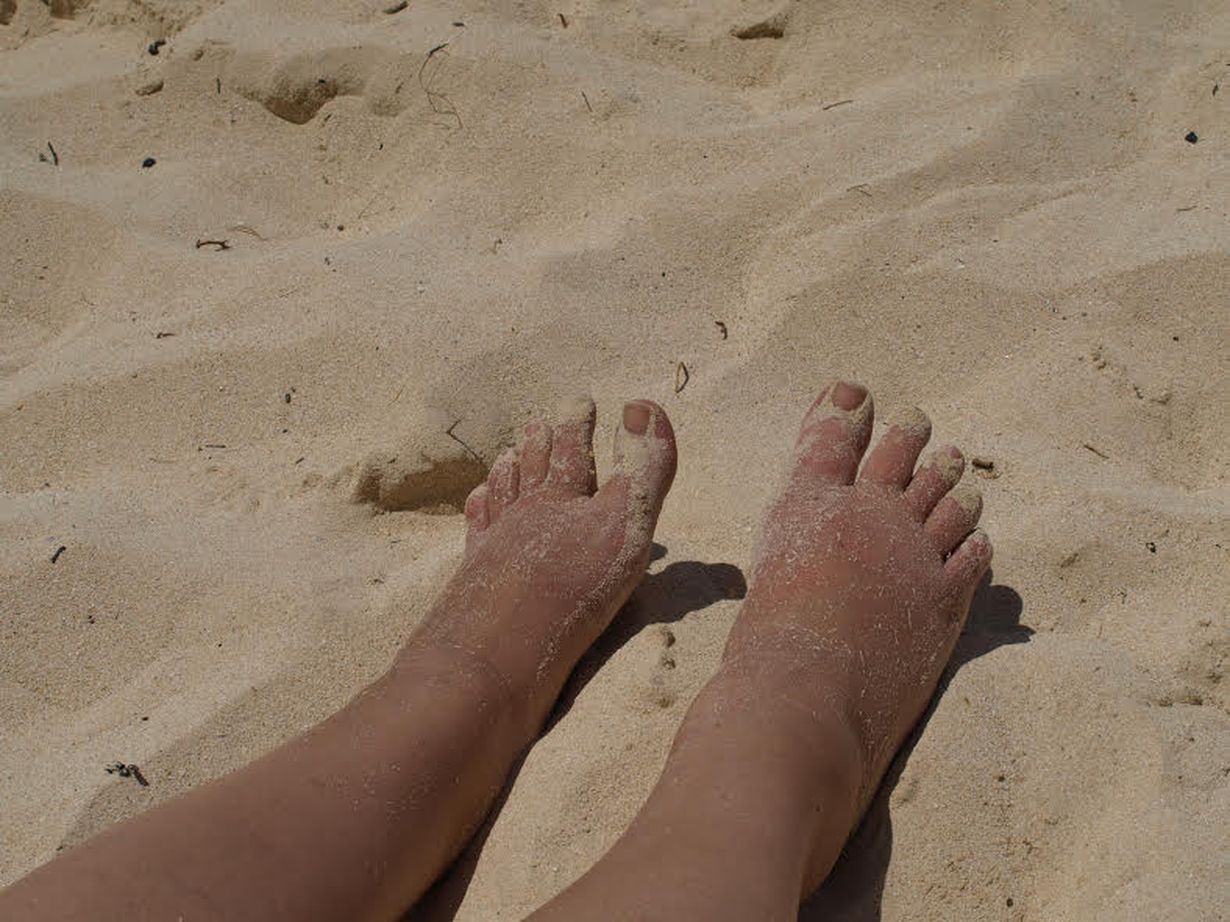 Kesä ja hiekkaa varpaiden välissä. Rantavarpaat loikoilee hiekalla.