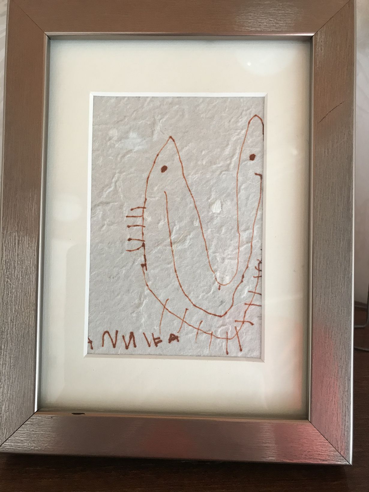 Tämän taideteoksen olen saanut ensimmäiseltä lapsenlapseltamme 3-vuotiaalta Annikalta. Se on koristanut kotiamme jo 10 vuotta, sillä taiteilija täyttää pian 13.