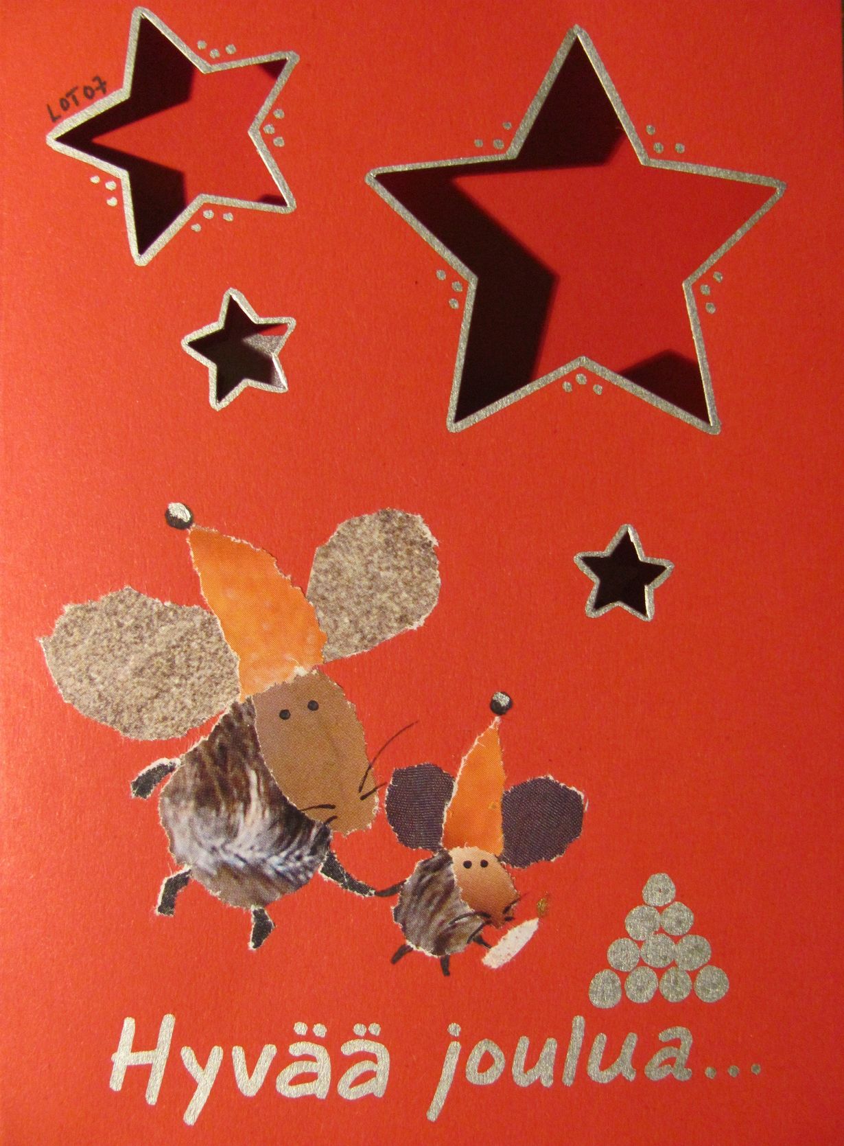 Vanhoista kuvalehdistä repimällä muotoilemani hiiritontut toivottavat ystäville hyvää joulua etusivulla ja tähdet hyvää uutta vuotta toisella sivulla.