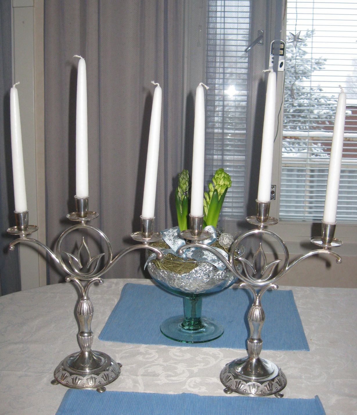 Hopeisen kynttelikköparin on 50 v. lahjaksi saanut mieheni äidin isä vuonna 1934 Viipurissa. Kynttelikköpari on erittäin hyväkuntoinen ja meillä aina näkyvillä ikkunalaudalla.
