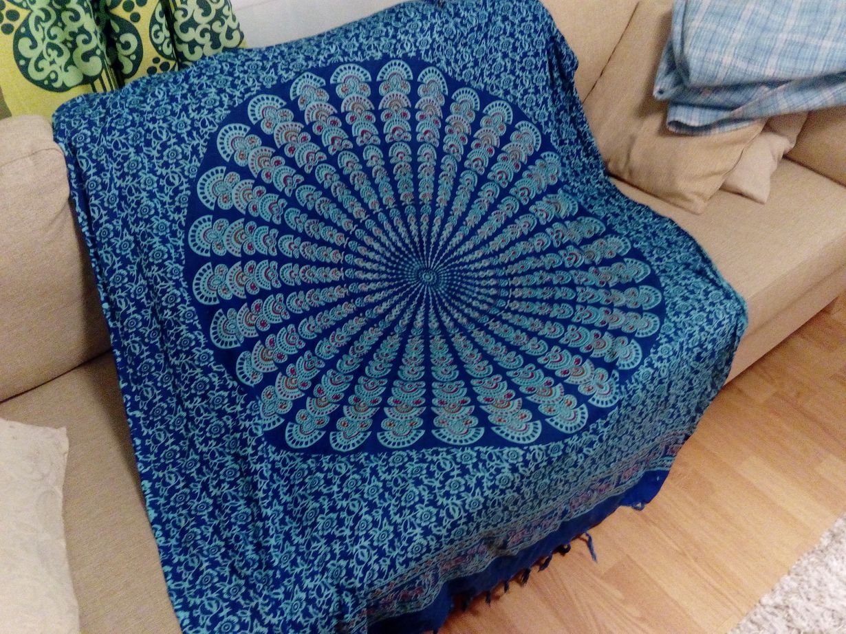 Avomieheni toi tämän huivin Balilta muutama vuosi sitten. Hänen on aina vaikea löytää reissuillaan jotain pientä tuliaista, mutta tämä on täydellinen. Se löytyi uimarannan myyjältä. Hän tietää, että pidän turkoosista väristä ja puuvillaisen ison huivin alla on ihana nukkua päiväunia. Vaikka se on ohut, se lämmittää.