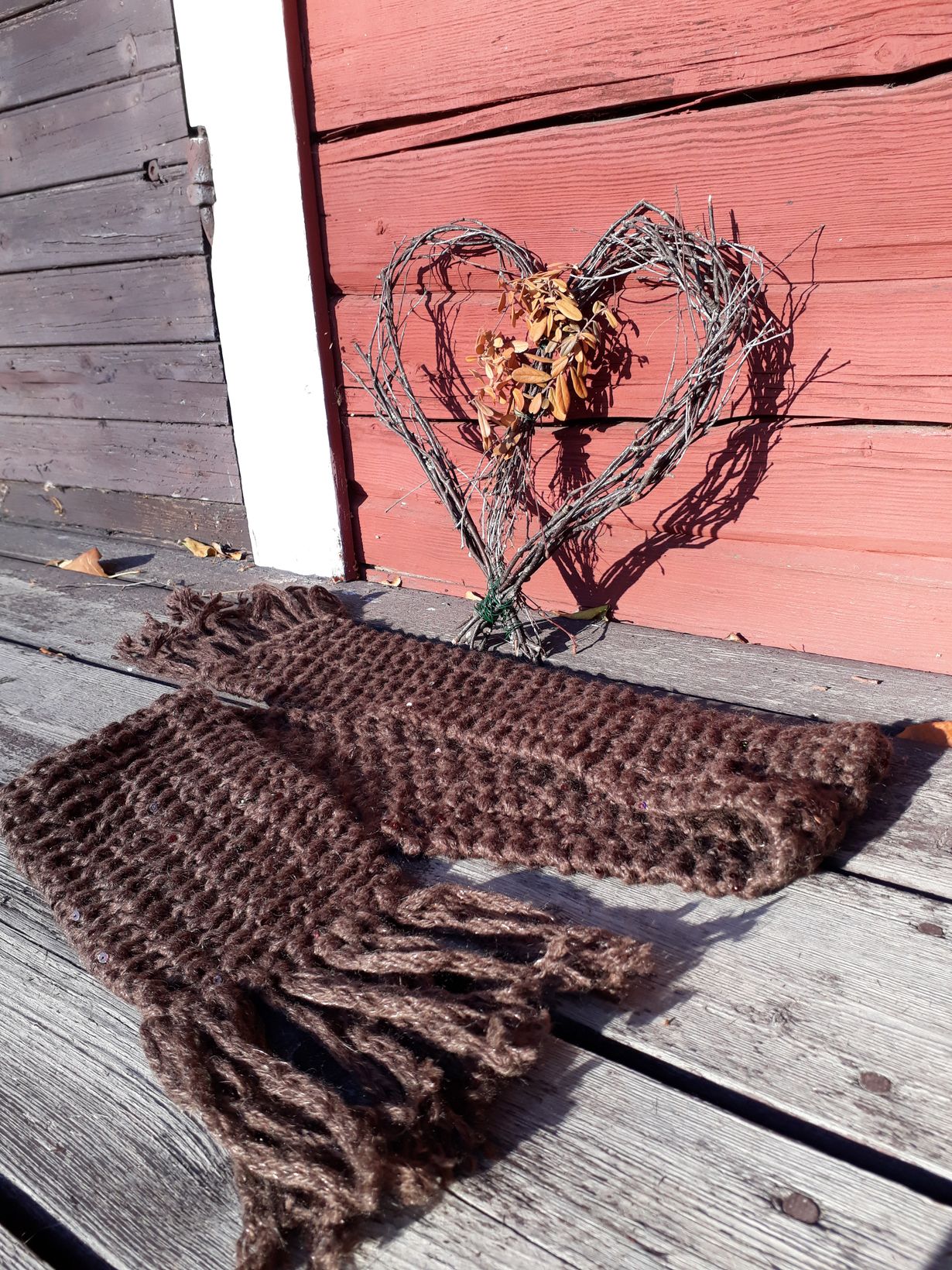 Neuloin huiveja ja pipoja (pipoa ei kuvassa) läheisille lahjaksi. Äidille annoin puunoksista tekemäni sydämen.
