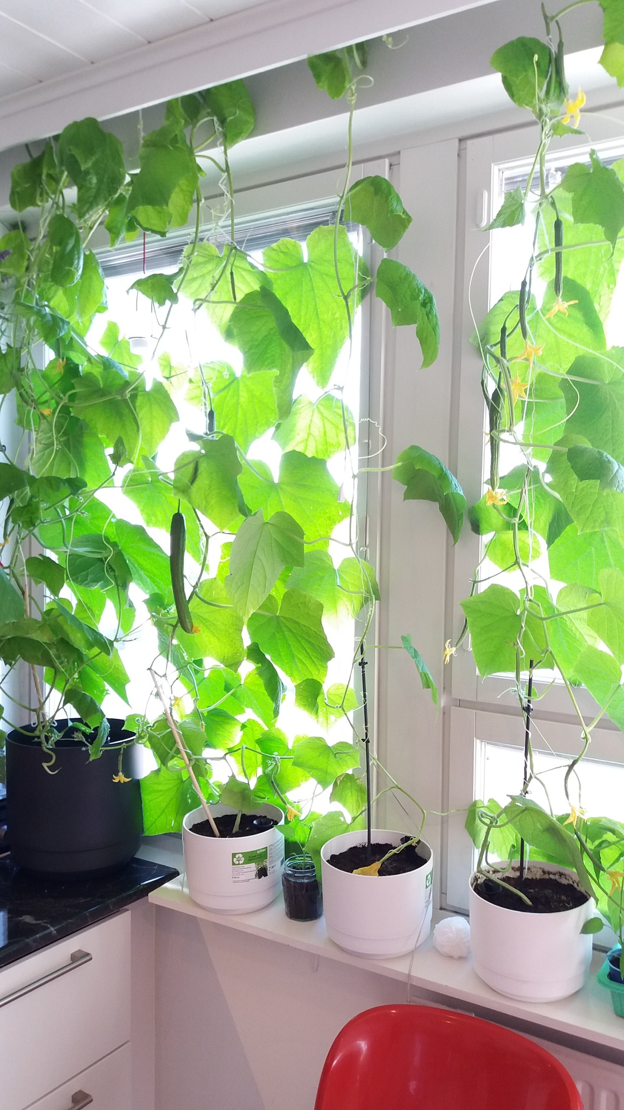 Kasvatin kasvihuonekurkkua siemenestä viime keväänä ja sehän kasvoi niin korkeaksi, etten uskaltanut enää siirtää sitä. Sain varsinaista lähiruokaa keittiön ikkunalta pitkään. Viherseinänä toimi myös. :)