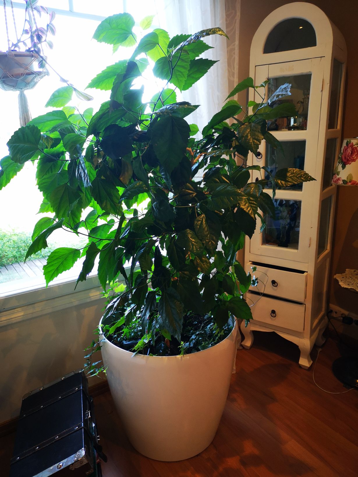 Kasvi on ostettu eläkeläiseltä, joka kertoi sen olleen hänellä kymmeniä vuosia. Kiinanruusu lopetti kukkimisen, kun vaihdoimme ison ruukun. Saa nähdä, saammeko kukkia vielä. 😊