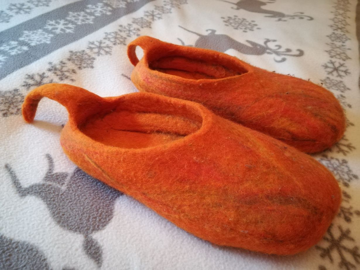 Pari vuotta sitten sain ystävältäni syntymäpäivälahjaksi huovutuskurssin. Epäilin ensin taitoani, mutta hyvässä ohjauksessa sain aikaiseksi muiden töiden ohella ihanat huopatossut! Lempivärinä oranssi, hieman muilla väreillä sävytettynä. Ovat olleet ahkerassa käytössä niin sisällä kuin saunareissuilla pihasaunassa.