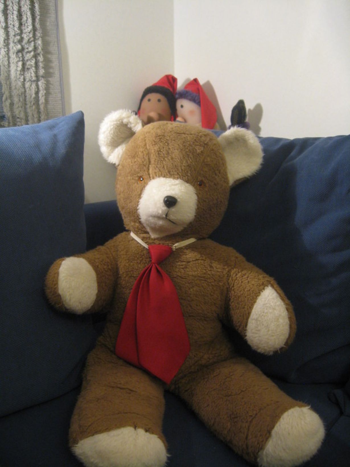 Muuttaessamme nelisen vuotta sitten autiona olleeseen mummonmökkin, tämä Nallekarhu maksi hyljättynä roskakasassa vintin nurkassa. Nyt hän viettää "eläkepäiviä" puhtaana samassa somassa kravatissaan olohuoneessamme tonttujen seurassa :)
