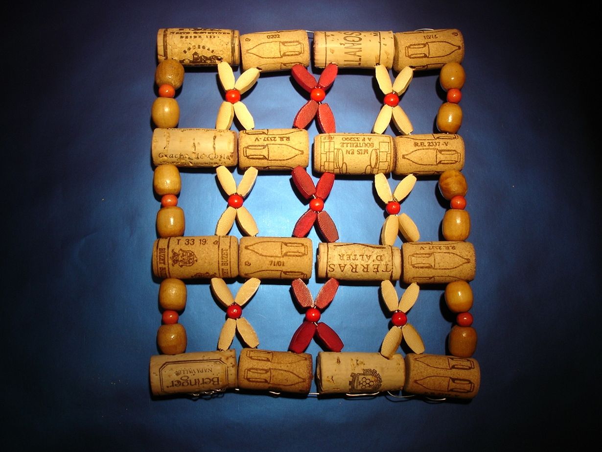 Tykkään kierrättää kaikkea. Tässä olen kerännyt viinipullon korkkeja, kirpparilta ostamani valmiin pannunalusen, jonka hajotin, sekä auton istuimissa olevia isoja helmiä. Sitten olen rautalangalla yhdistänyt koko komeuden ja saanut aikaiseksi pannunalusen.