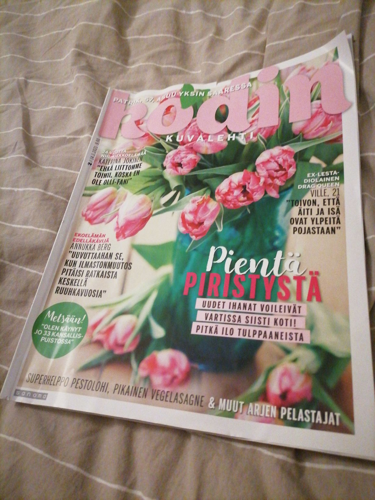 Tykkään lukea iltalukemisena lehtiä, Kodin Kuvalehti ja Me Naiset ovat suosikkeja. Sopivan lyhyitä artikkeleita on mukava lukea ennen kuin uni tulee.