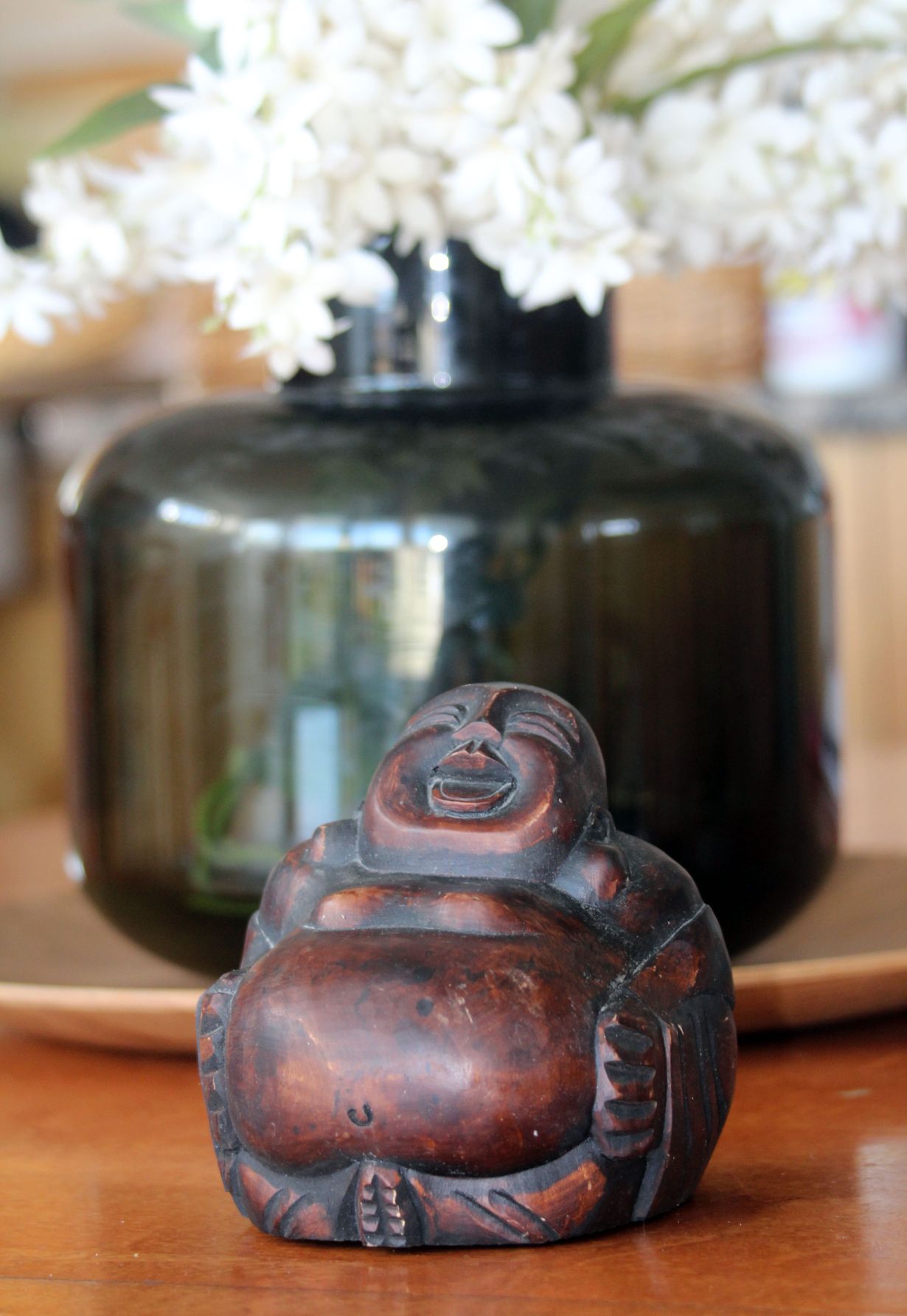 Joskus 2000 -luvun alussa reissasin ahkerasti Kiinassa ja käytiin perheen kanssa lomallakin siellä. Jossain Pekingiläisessä kaupassa ehdottivat, että isäntä tarvitsee tämmöisen. Se tuo kuulemma hyvää onnea. Liekkö toinen syy ollut se, että on vähän samaa näköäkin... Siitä asti kaveri on hymyillyt meillä ja ehkäpä ripaus onneakin on tullut mukana.