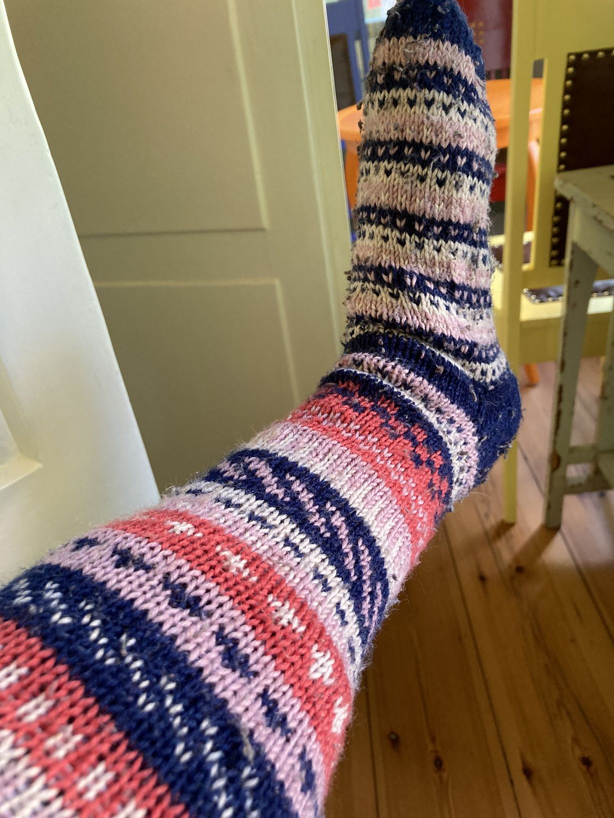 Ihana, jo eläkkeellä oleva, entinen työkaverini on neulonut minulle joskus 15 vuotta sitten nämä ihanat villasukat kiitokseksi kun hän haki meiltä omenia. Sukat on taas pesty ja odottaa ensi talvea kun pääsevät lämmittämään jalkojani etätöitä tehdessä 40-luvun puutalossa😄🙏👍.