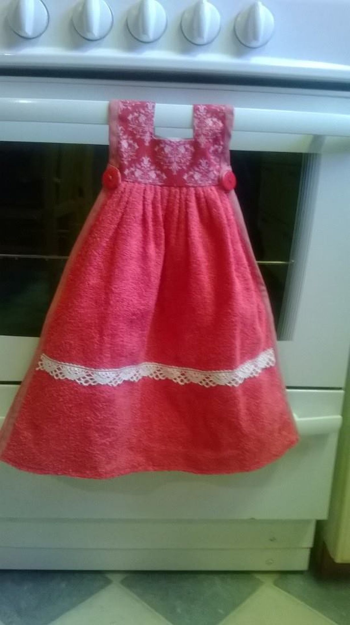 Tämä punainen mekko-keittiöpyyhe on kaunis ja toimiva. Aina esillä, joten siihen on helppo kuivata kädet. Minulla on näitä erivärisinä ja olen antanut myös lahjaksi tyttärelle, siskolle ja miniälle.