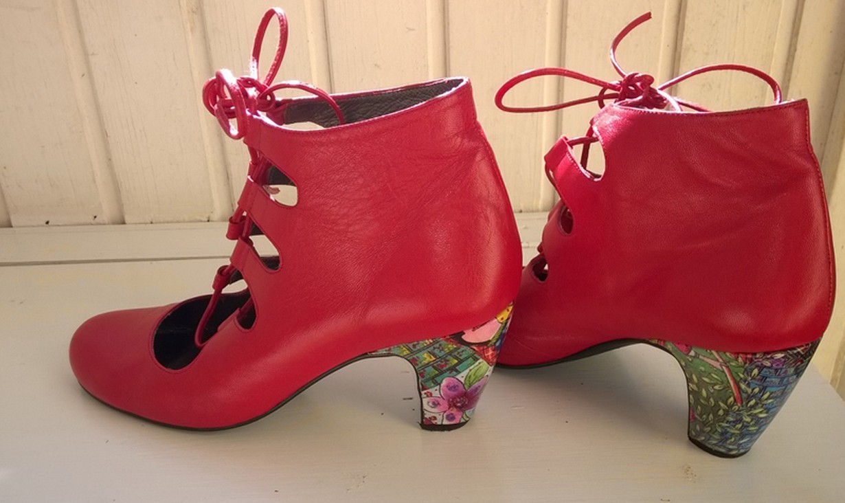 Menin kenkäkauppaan Helsingin Fredalla. Nämä kengät pistivät heti silmääni. Niitä oli mustina ja punaisina – mustissa tosin oli tavalliset mustat korot. Siinä miettiessäni otanko turvalliset mustat vai värikkäät punaiset, vanhempi myyjä tuli avuksi. Hän sanoi, että kai sitä nyt joskus voi vähän räväyttää. Minähän räväytin ja olen näillä nyt räväyttänyt silloin tällöin lähes kymmenen vuotta.
