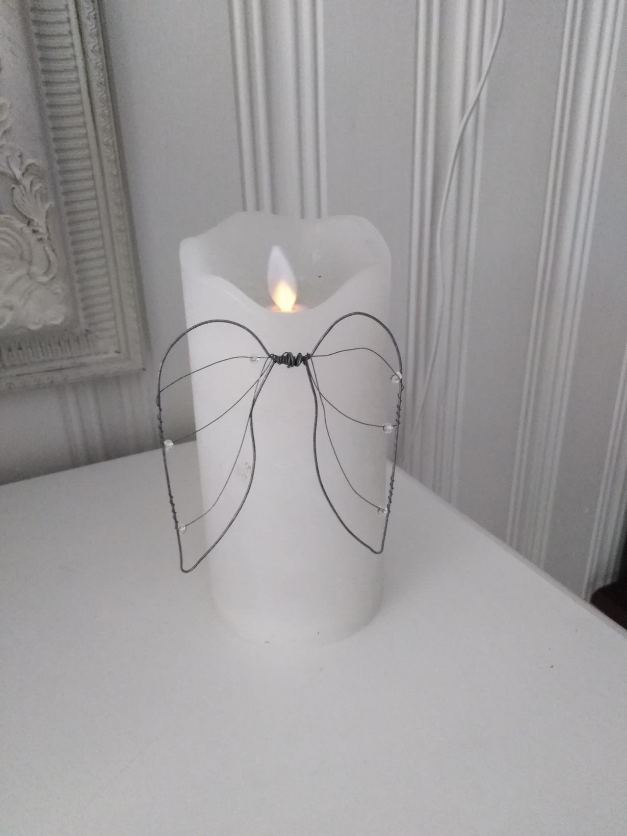 Sain tämän kestokynttilän aikuiselta tyttäreltäni joululahjaksi. Lisäsin nämä enkelinsiivet, kun ne sattumalta laatikosta i löysin. Laitan kynttilän loistamaan lähes päivittäin lapsenlapseni tai kahden tyttäreni valokuvan viereen takan päälle. Katseeni osuu kynttilään ja valokuviin samalla kun katselen sohvalta tv. tä.