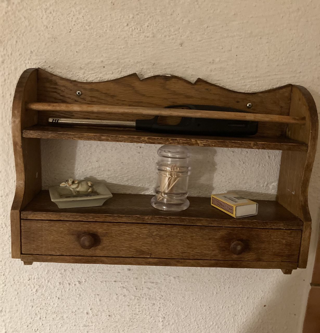 Olen tehnyt tämän maustehyllyn peruskoulun kahdeksannella luokalla vuonna 1967. Tyttöjen puukäsityö tunnilla kovastikin opettajan avustamana. Hylly on seinällä edelleen.