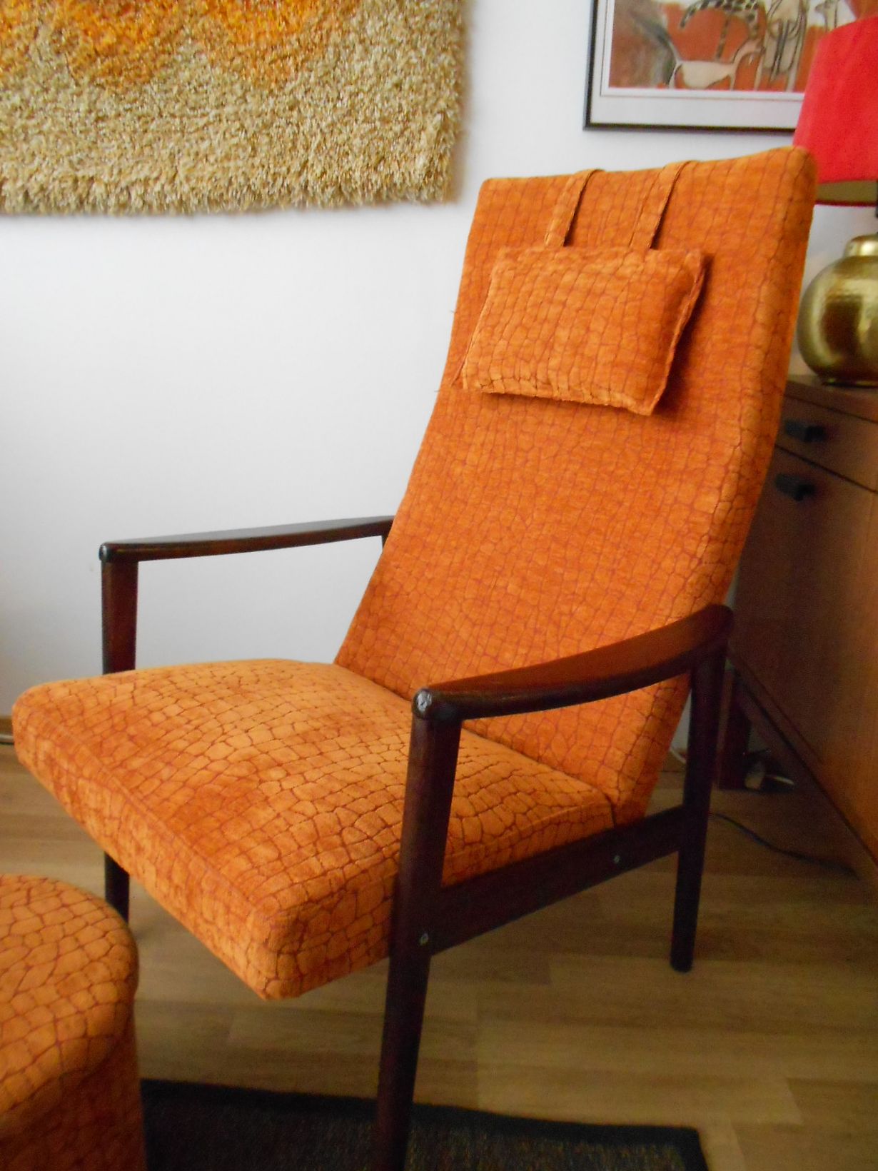 Rakkaan ystäväni kunnostama nojatuoli, jonka häneltä yllättäen sain, sopii räväkän värisenä ja 60-luvun tyylisenä täydellisesti lämpimän värikkääseen kotiini - ja on ihanan mukava istua. Kiitos ystävä!