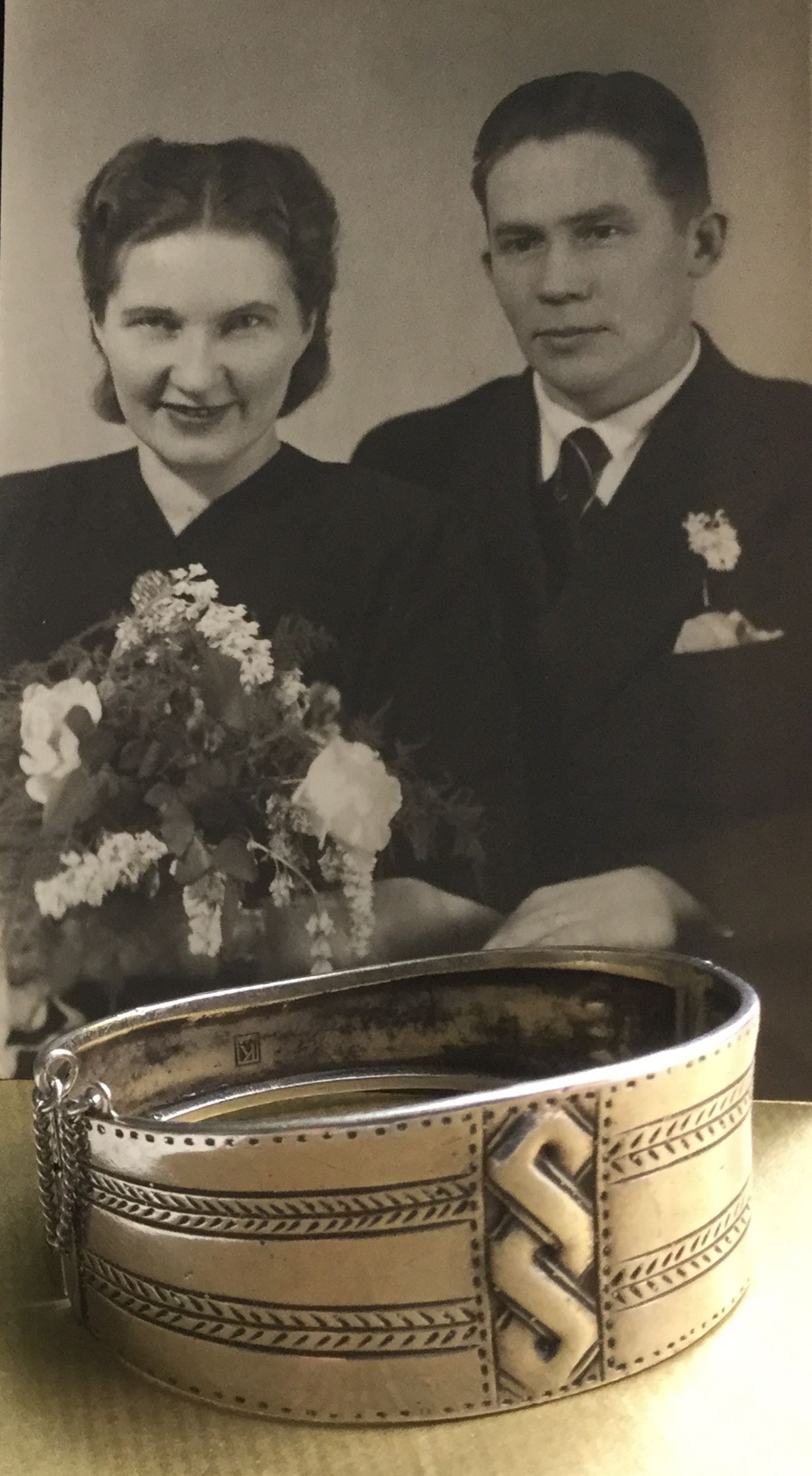 Setäni oli ostanut rannekorun morsiammelleen muistuttamaan heistä tulevan eron aikana. Sota oli nimittäin juuri syttynyt ja setäni lähti palvelukseen kauppalaivastoon ja tätini lotaksi sotasairaalaan. Kukaan ei voinut tietää tavattaisiinko enää koskaan. Rannekorun takaosaan on kaiverrettu teksti: