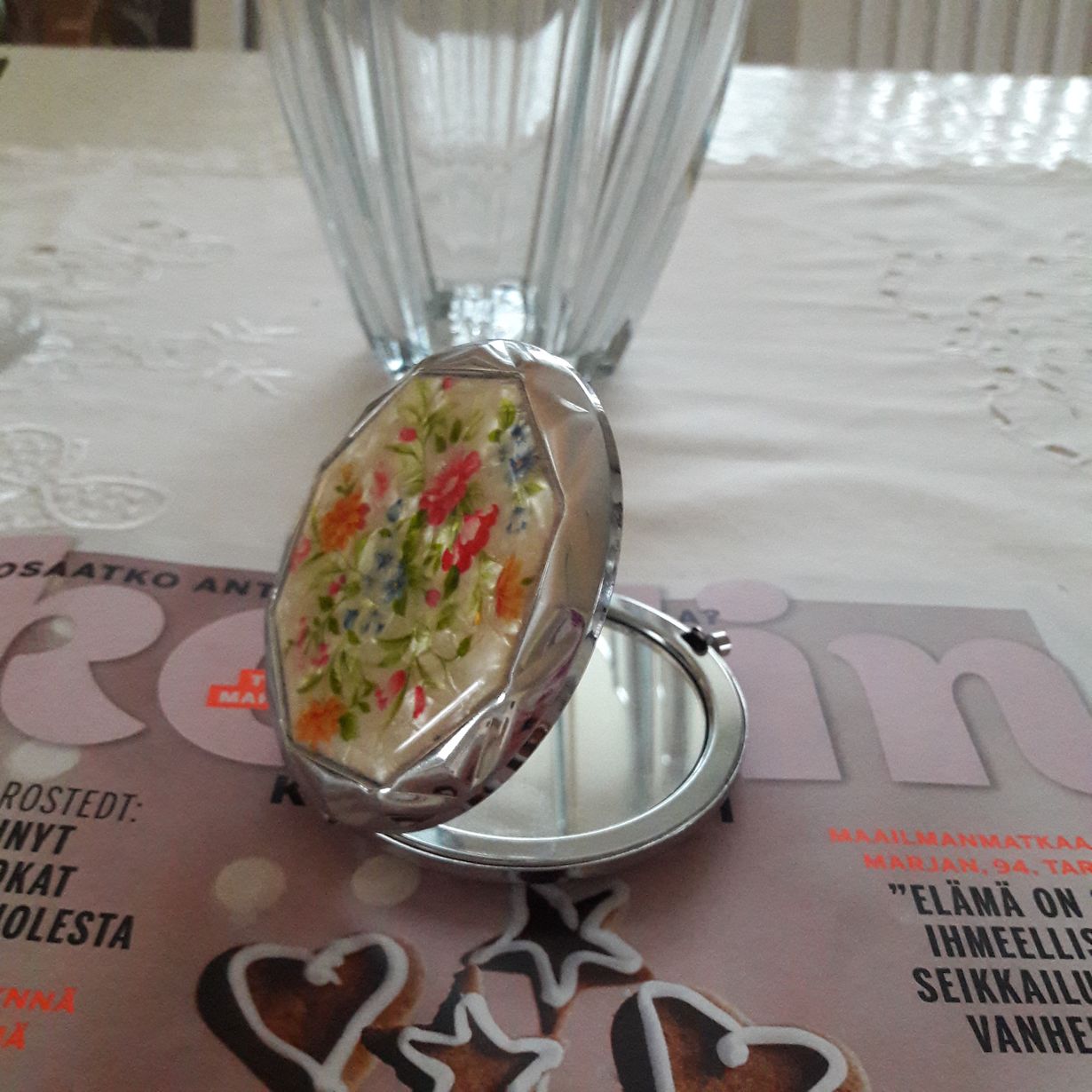 Olen tämän peilin saanut ystävältäni lahjaksi yli kymmenen vuotta sitten. Peili kulkee aina mukanani käsilaukussa. Se muistuttaa päivittäin ystävästäni.