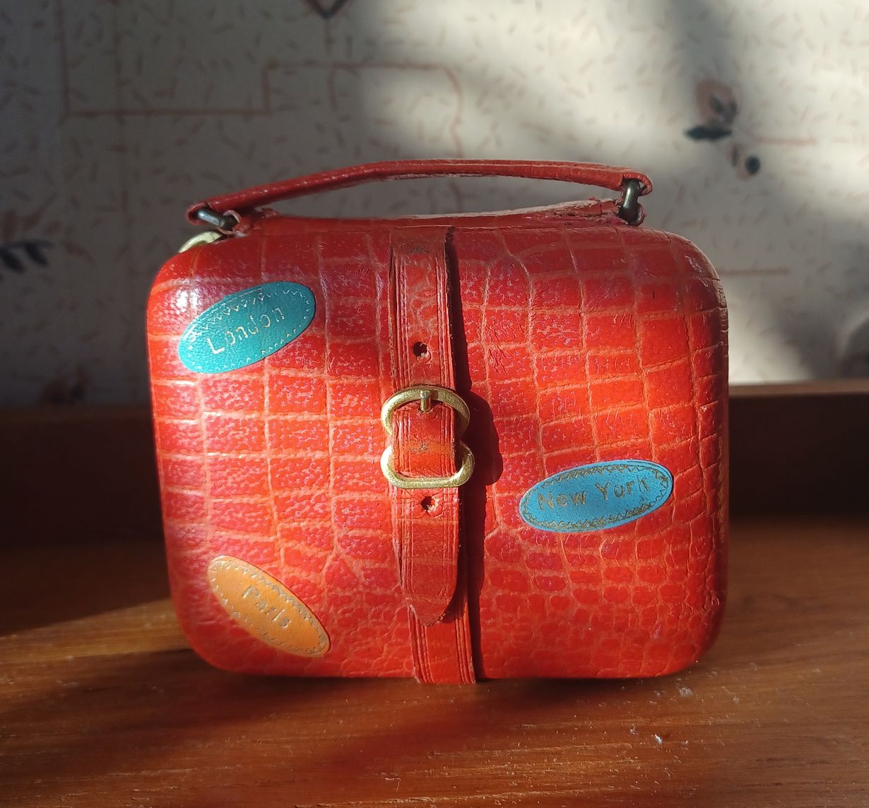 Tämä hellyttävä pieni matkaherätyskello löytyi kauan sitten kirpputorilta. Päällinen on aitoa nahkaa ja kellon koneisto saksalaista laatutyötä. Herätysäänikin vanhanaikainen pirinä. Matkalaukussa vielä tarrat London, Paris ja New York. Kun matkalaukun vetoketjun avaa, niin sieltä tulee esiin kello, jonka saa nojalleen laukun reunaa vasten. Pitää lähettää vielä kuva kellosta avattuna.