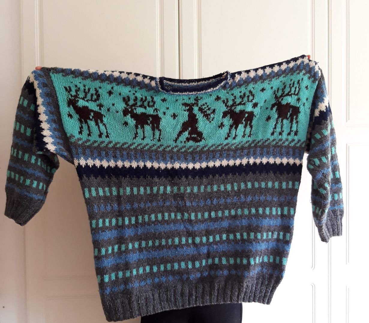 Neuloin tämän villapaidan 35 vuotta sitten lahjaksi silloiselle metsästystä harrastavalle poikaystävälleni eli nykyiselle aviomiehelleni. Paidasta tuli XXL-kokoinen ja mieheni on kokoa S, joten käyttöä paidalla ei ole ollut. Onpa kuitenkin mukava muisto seurustelun alkuajoilta.
