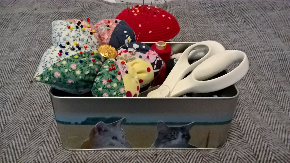 Kissaihmisen ompelurasia. Neulatyyny on arpajaisvoitto. Unelmoin aina tekeväni tilkkutöitä, mutta saa nähdä jääkö ikuiseksi haaveeksi!