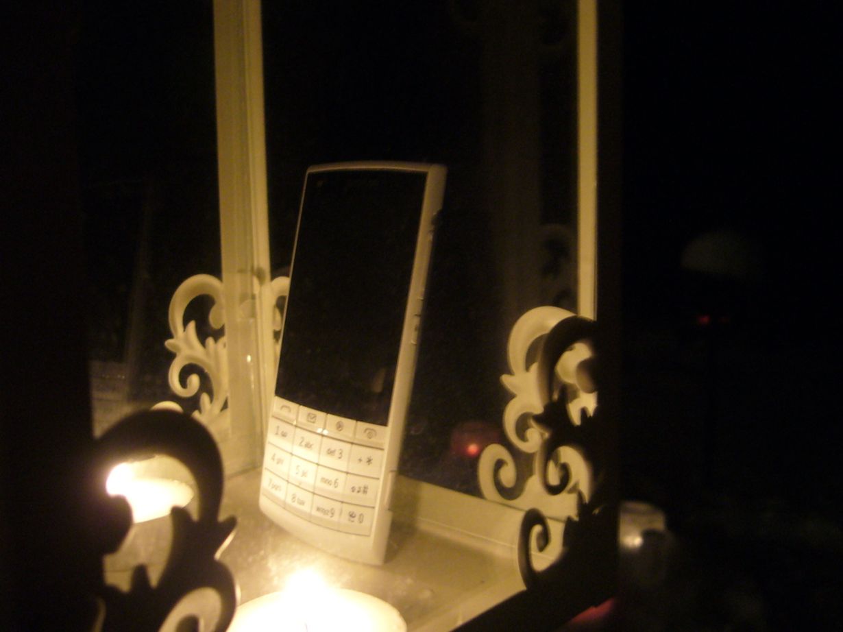 Otin kuvan kännykästäni takapihalla olevassa lyhdyssä.Tämä kännykkä on minulle todella tarkeä ja senpä takia halusin kuvata "hänet" kynttilän valossa uudenvuoden aattona 2011.