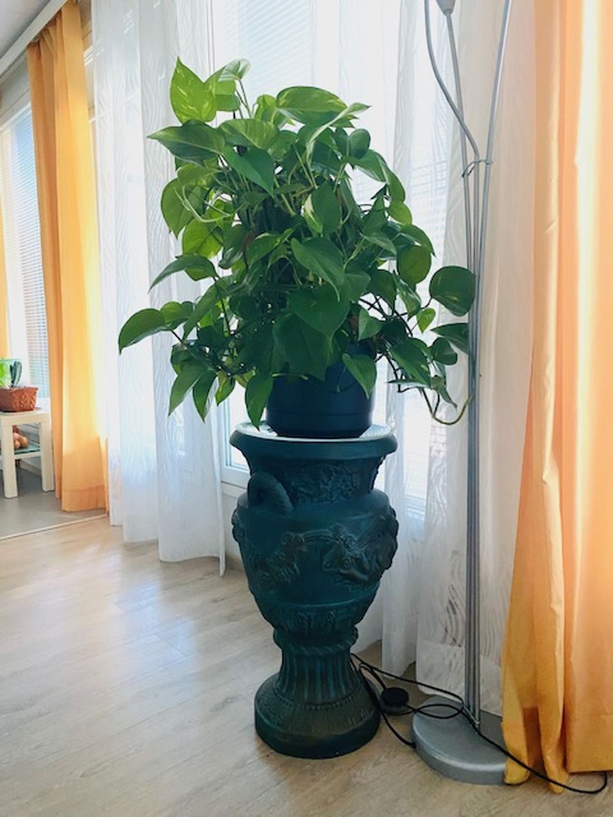 Iso kultaköynnös viihtyy aurinkoisella ikkunaseinällämme. Siitä harvinainen kasvi, että me molemmat pidämme toisistamme.
