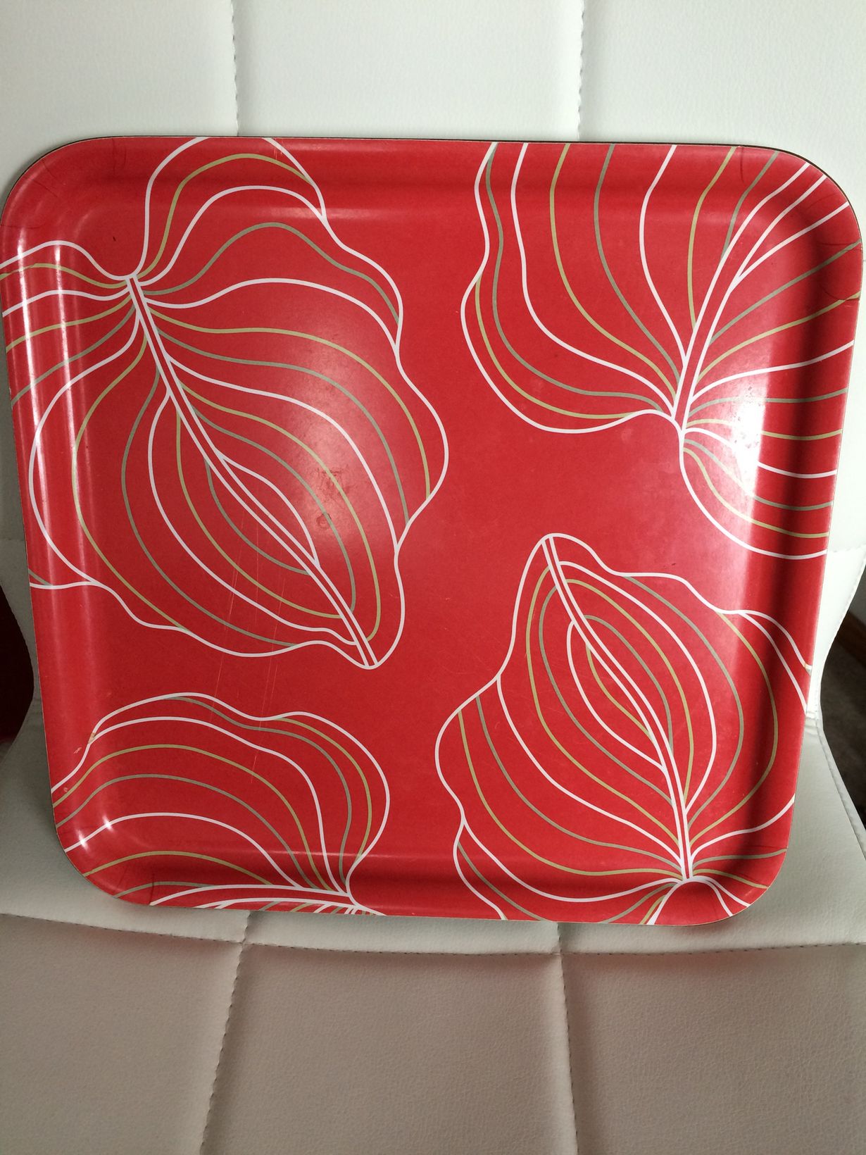 Pitkään käytössä ollut näppärän kokoinen tarjotin.