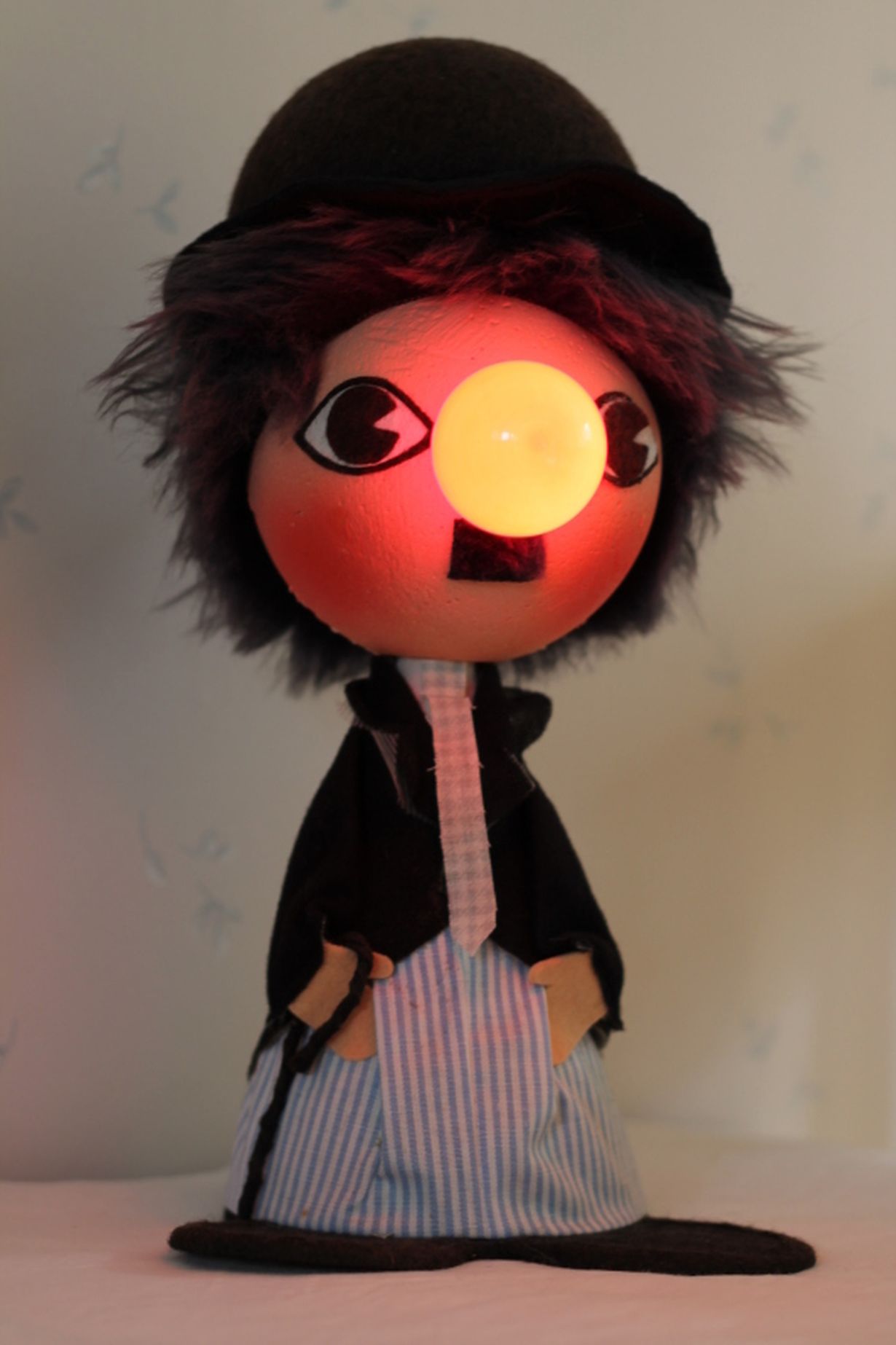 Charlie Chaplin lamppuuni ihastuin Lido Di Jesolossa Italiassa 29-vuotta sitten. Monta muuttoa lamppu on kokenut vuosien varrella ehjänä pysyen. Chaplinin "nenälamppu" on punainen,mutta kuvassa näyttää valkoiselta.