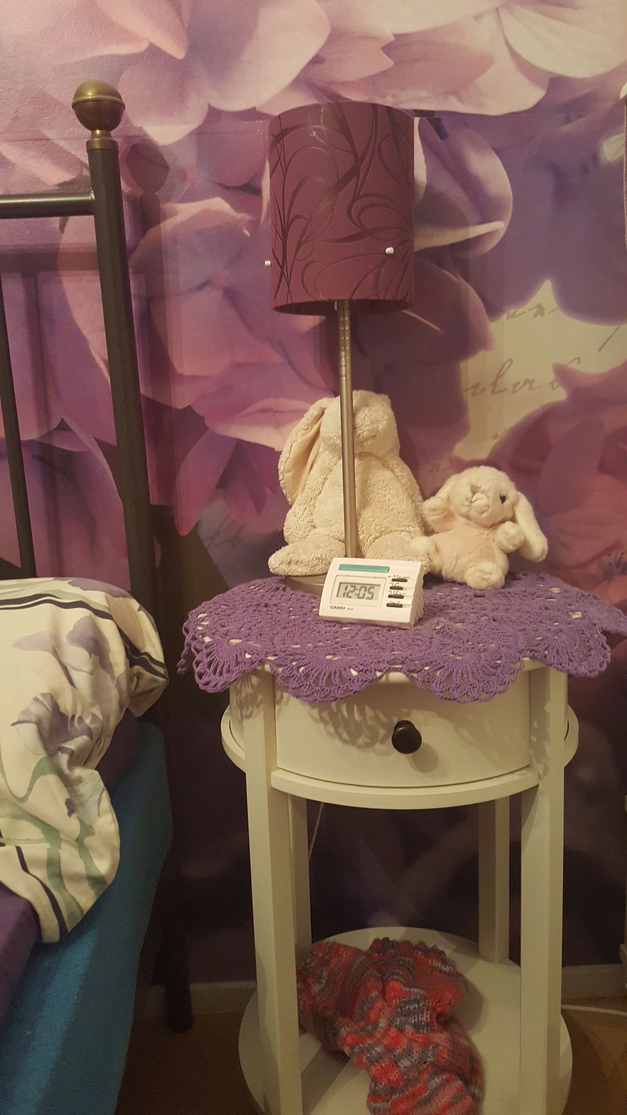 Olen romantikko ja rakastan lilaa. Naapurini virkkasi minulle lahjaksi pöytäliinan joka on juuri sopiva pöydälle. Varaäitini kutomat villasukat odottavat kylmiä kelejä pöydän alla. Rakkaalta edesmenneeltä ystävältäni saamani pupu ja sen kaveri vahtivat untani.