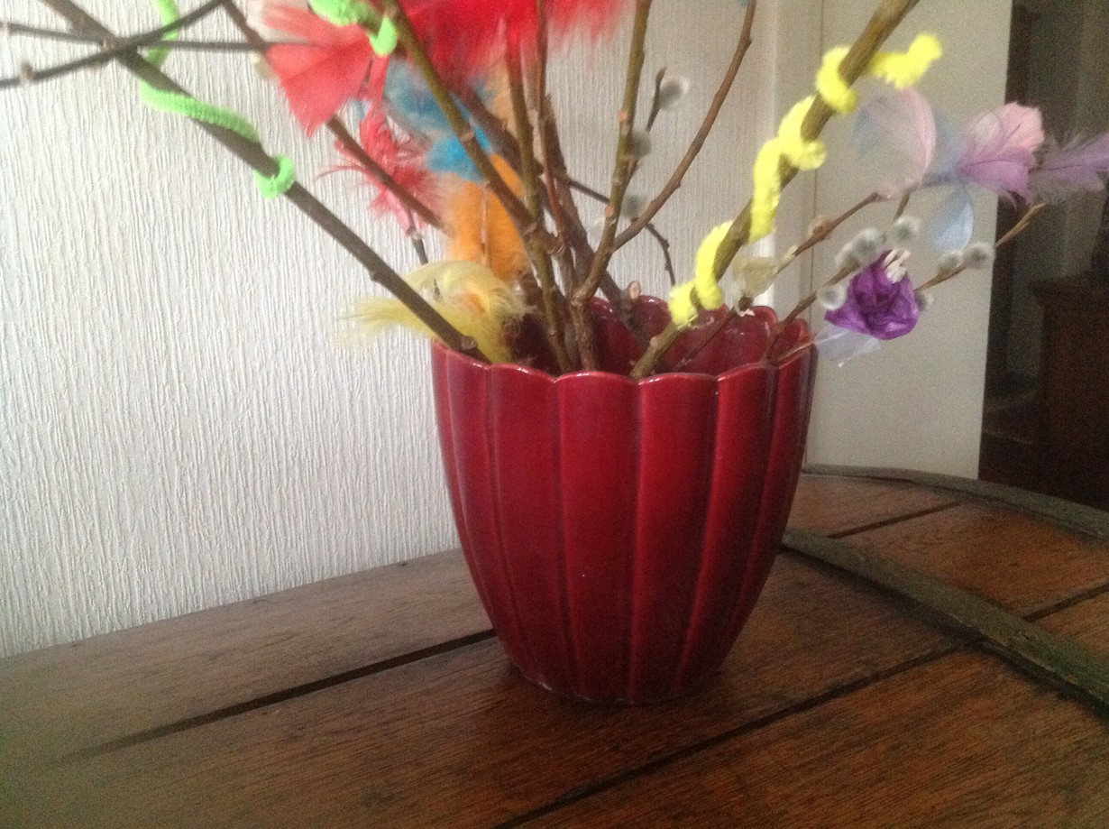 Kupittaan Saven ruukku, tarrakin on vielä paikoillaan. Ostin muutama vuosi sitten kirppikseltä. Ei ole siihen sopivaa kukkaa vielä, joten virpomisen oksat sopii hyvin.