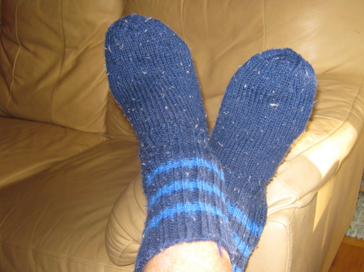Nämä sukat ovat jo aikansa nähneet. Sain ne äidiltäni, kun hän vielä jaksoi neuloa. Sukat ovat eri kokoiset ja toinen sukka tahtoo pudota jalasta. Kissoistani on tarttunut sukkiin "palloja", jotka lähtevät vain saksilla leikkaamalla. En raaski luopua sukista, ne ovat aivan ihanat!