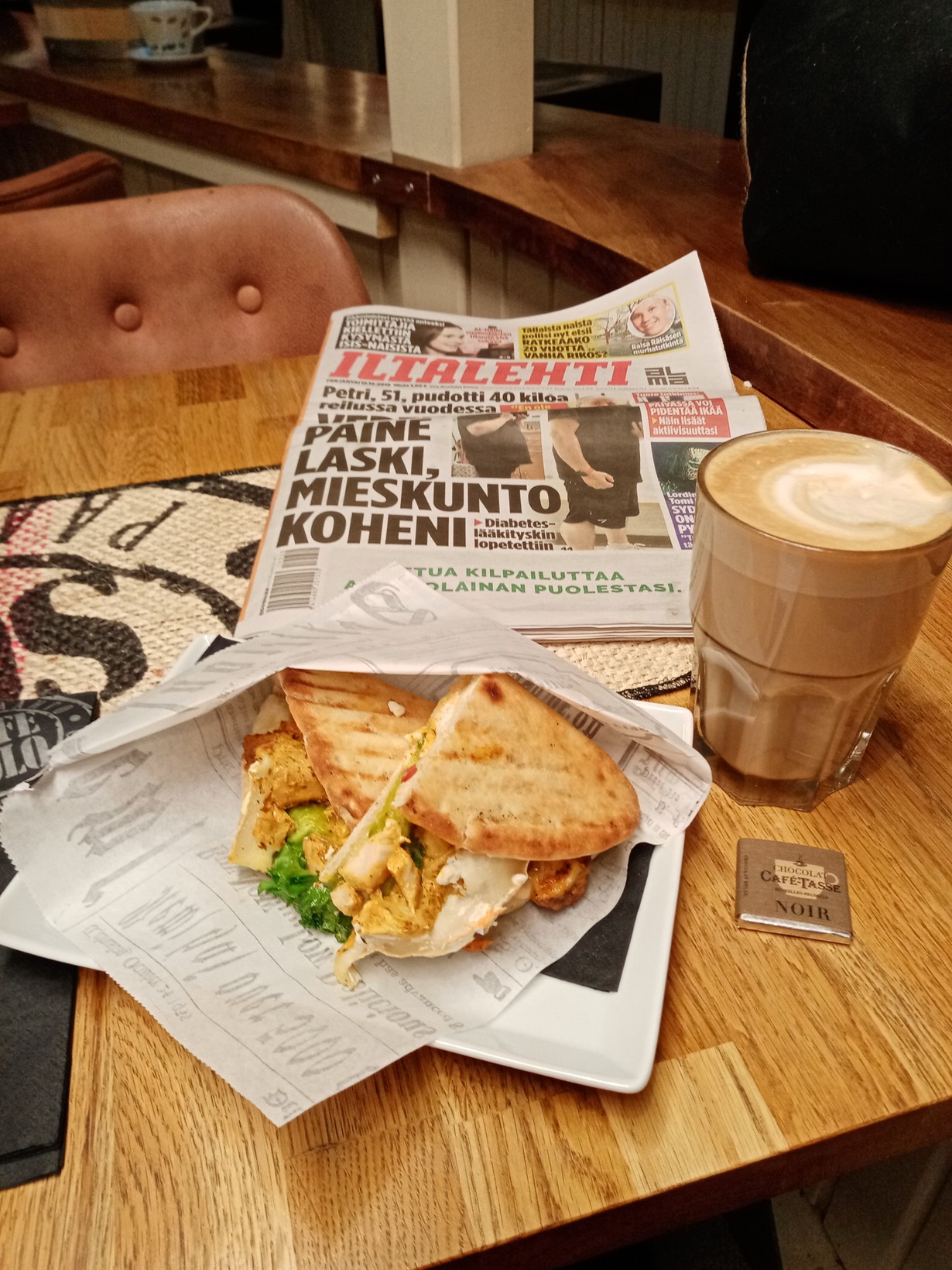 Pariloitu kana-vuohenjuustoleipä ja caffe latte. Ihanat kahvilat ovat arjen luksusta, joten niistä en suostu luopumaan. Näitä herkkuja pääsin nautiskelemaan Porin kauppahallissa.