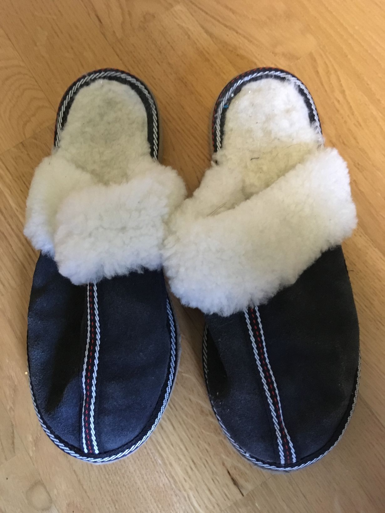 Miehen tädillä Ranskassa oli lampaita ja hän on itse tehnyt nämä tossut. Kuluneet ovat jo mutta niin mukavat ja lämpimät.
