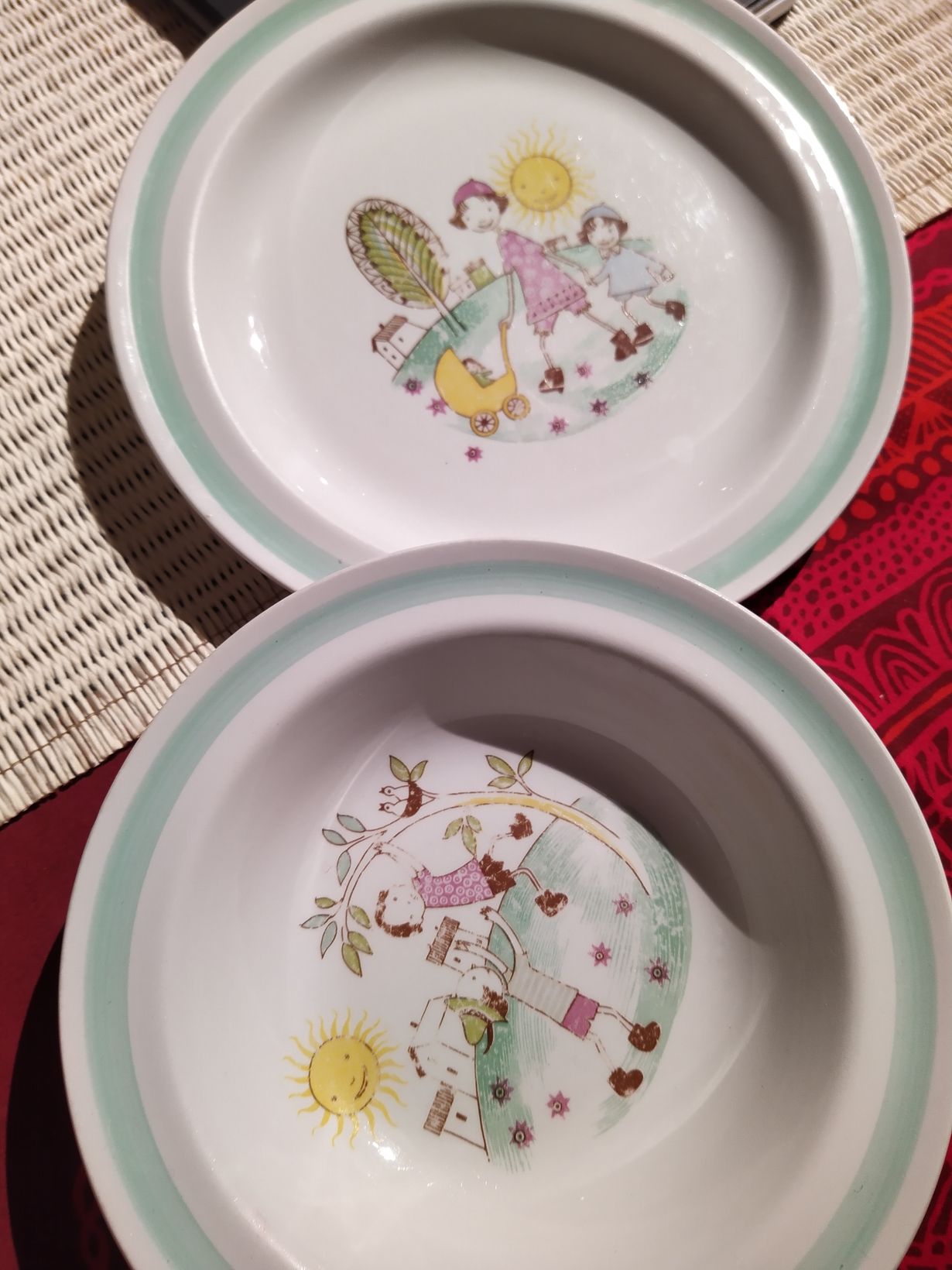 Lasten "juhlalautaset", joilla suuri tunnearvo. Lautaset kuuluivat aikoinaan serkulleni, joka nukkui pois jo teininä -70 luvun alussa. Nyt niitä saa käyttää jo minun lapsenlapseni.❤️