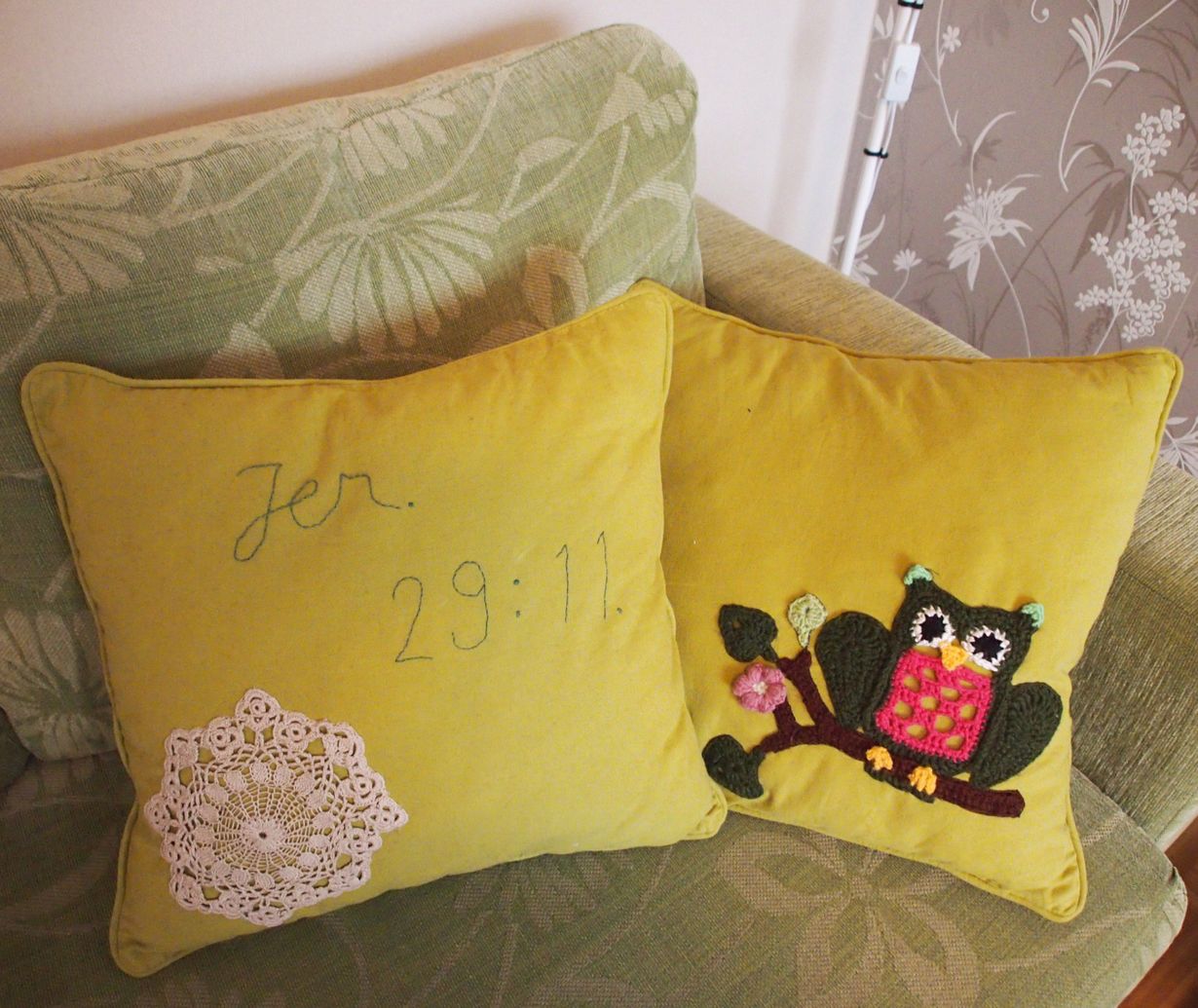 Tämä ihana arki: sohvatyyny Ihanat uniikit tyynyni 20.2.2014 klo 19:06 Ystäväni teki nämä tyynyt minulle lahjaksi. Pidän pöllöistä ja vihreästä ja Raamatun jae on yksi suosikeistani. Liisa