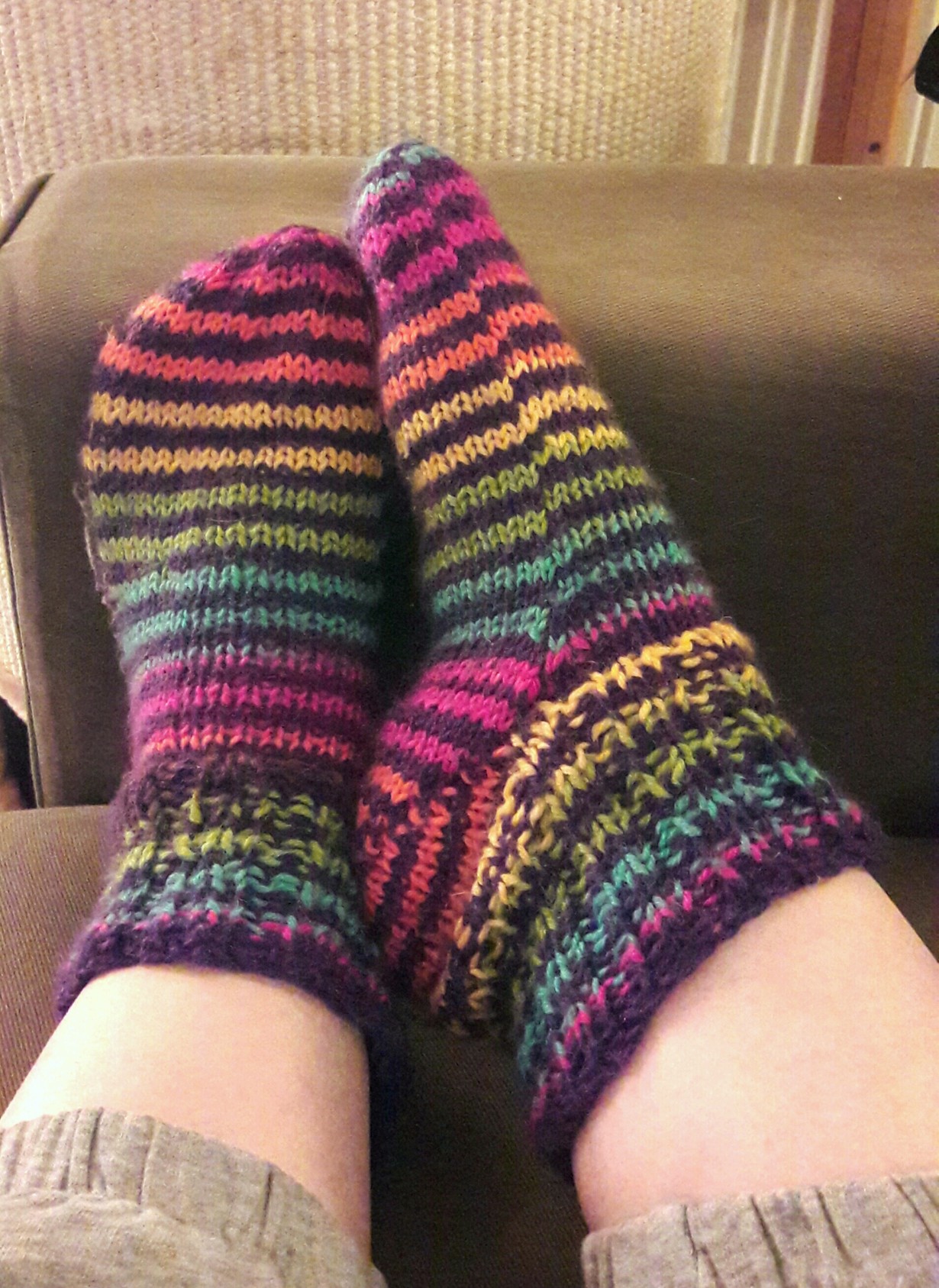 Tällä hetkellä tekeillä on joululahjasukkia, mutta nämä raitaiset on viimeiset itselle tehdyt, kun edellisiin tuli reikä. Olen laiska parsimaan, joten teen usein uudet sukat, siksi onkin kerääntynyt korillinen parsittavaa. Toisipa pukki parsintasienen!