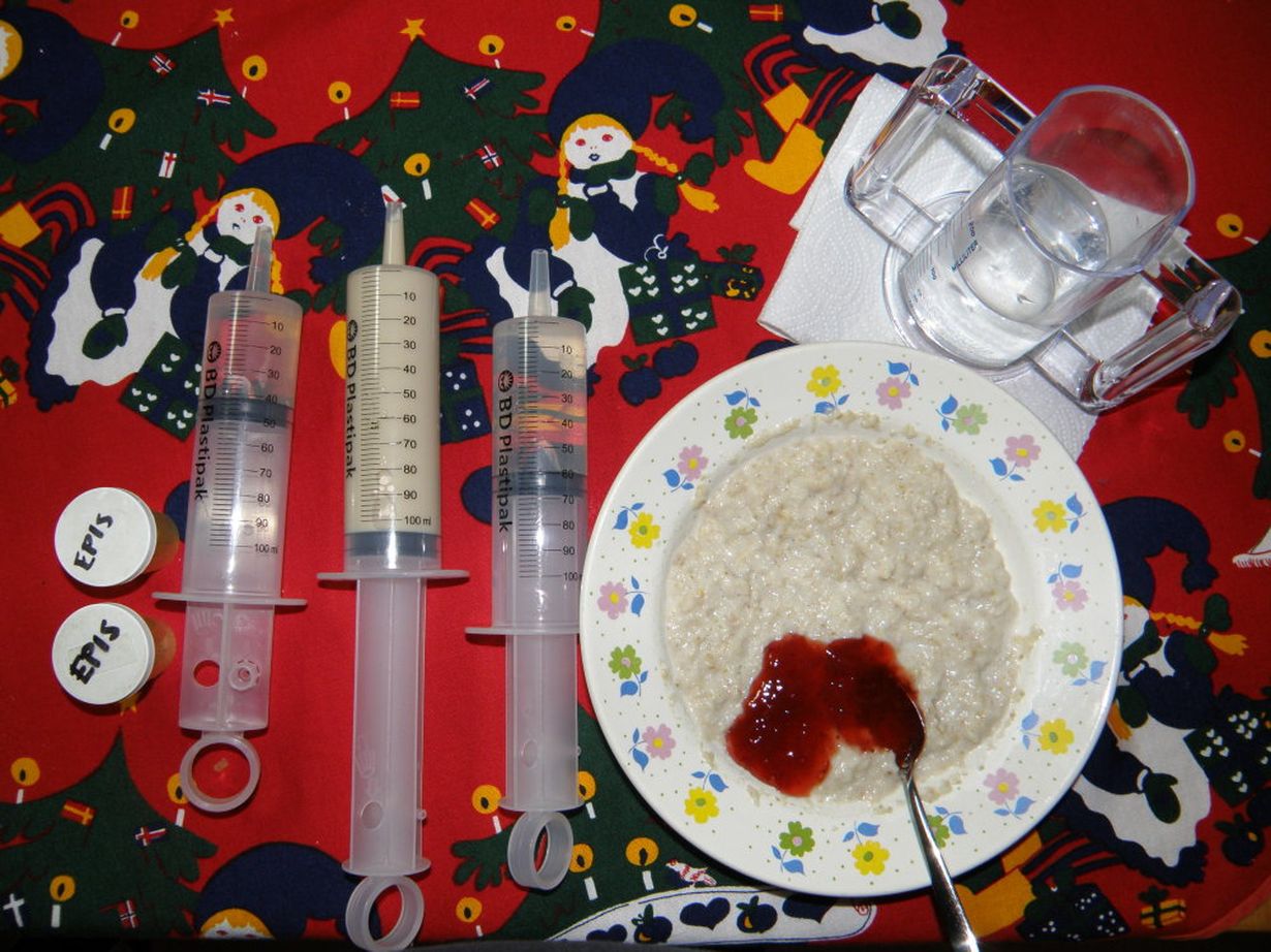 "iiskalle" on laitettu ravitsemusavanne ja gastrostomialetkun kautta ruiskulla laitetaan vatsanpehmennyslääke, sen jälkeen ravintoliuos sekä viimmeiseksi puhdasta vettä. Tästä koostuu "iiskan" aamupala :)