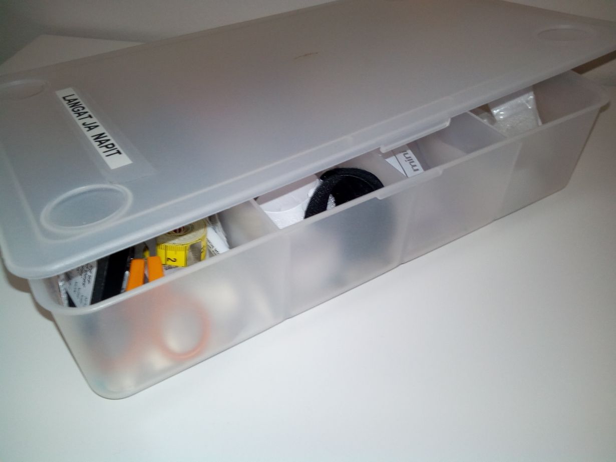 Ikean muovilaatikko on oiva ompelulaatikoksi, pikku koloihin saa hyvin järjestelyä langat,napit, neulat ym.