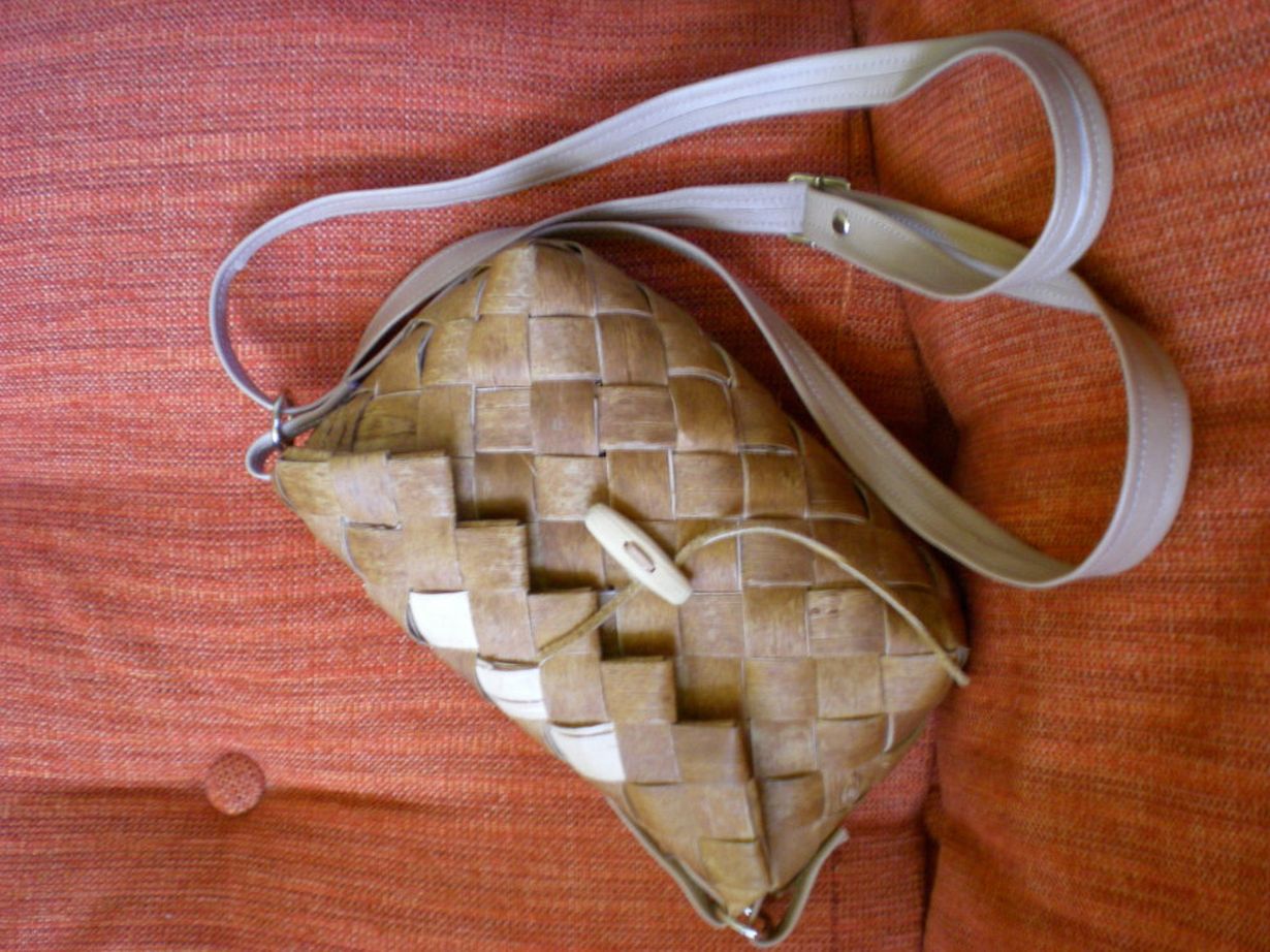 Sain tämän pikkuruisen tuohesta tehdyn laukun 16-vuotis syntymäpäivänäni tuttavaperheeltäni. Laukkuun mahtuu juuri ja juuri pieni kukkaro, puhelin, huulirasva, puuterirasia sekä kampa. Laukun koko sulkee pois turhan roinan.