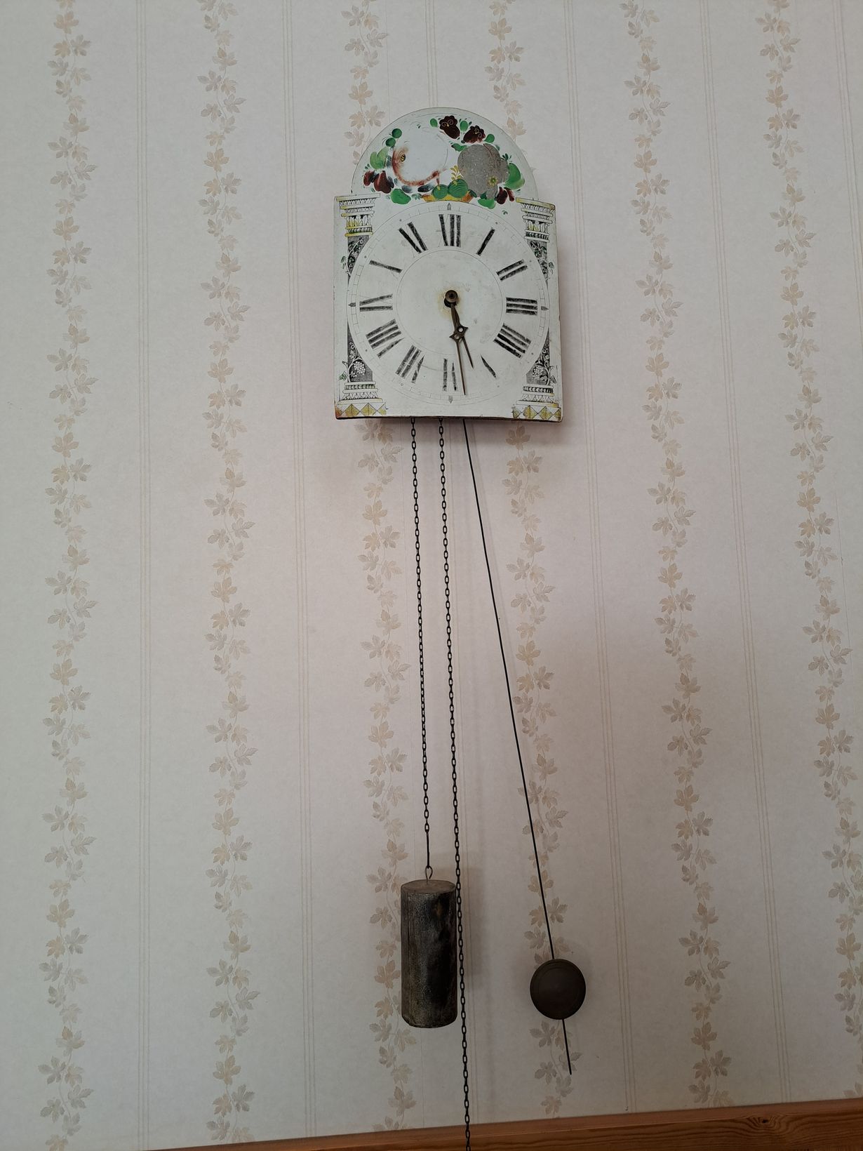 Tämän kellon takana on vuosiluku 1884, ja yhä käy, kun muistaa vetää joka aamu.