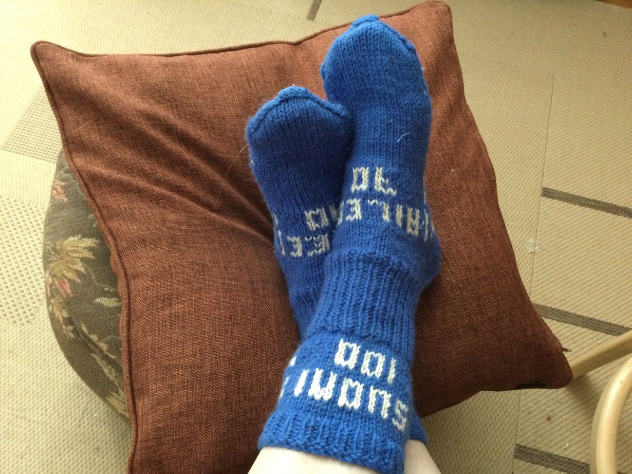 Vuonna 2017 Suomi täytti 100 vuotta ja minä 70 vuotta ja Teksasista asuva sukulainen 50 vuotta. Olihan sitä juhlistettava. Saimme sisareni kutomat nimikkosukat - minä Suomi 100 Ailee 70. Vieläkin lämmittävät juhlien muistot ja sukat.