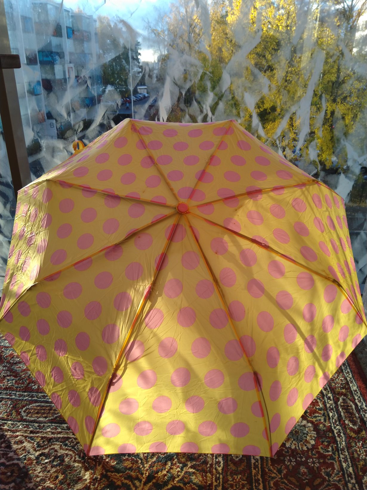 Aina, kun ostan sateenvarjoa, ajattelen, että nyt ostan hillityn mustan, jota voi käyttää kaikissa tilaisuuksissa hautajaisista häihin. Ajatus on kaunis, mutta ei kovin onnistunut: minulla on viimeksi ollut musta sateenvarjo 15 vuotta sitten. Ihastun aina värikkäisiin sateenvarjoihin, jotka tuovat iloa muuten harmahtaviin päiviin. Tämän löysin Tigerista, kun kesken päivän alkoi sataa yllättäen ja minulla oli ulkona käveltävää, enkä halunnut kastua.