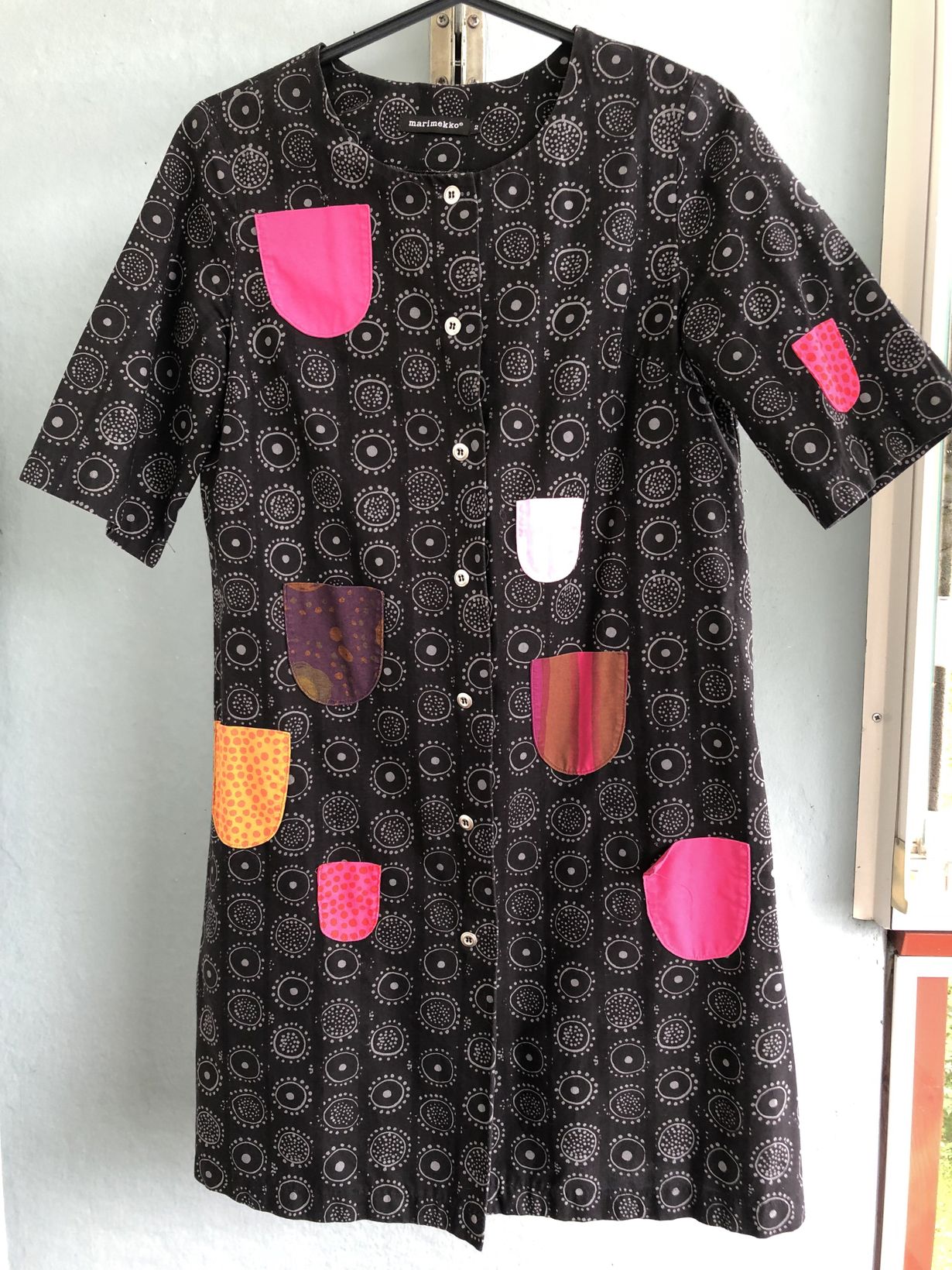 Joskus työpaikan kahvipöydässä käytiin keskustelua Marimekon klassikoista. Kerroin työkavereilleni aina haaveilleeni ostavani joskus "opemekon" eli Marimekon "Kihlataskun" tai lastenmalliston "Iloinen takki"- mekon. Aikaa kului ja eräänä kauniina kevätpäivänä työkaverini Anna toi minulle tuliaisia kirpputorilta. Hän oli ostanut Iloinen takki-tunikan minulle! Olin tästä eleestä niin liikuttunut ja onnellinen. Opemekko on ollut ahkerasti käytössä ja joka kerran päälle pukiessa muistuttamassa minua ihanasta Annasta.