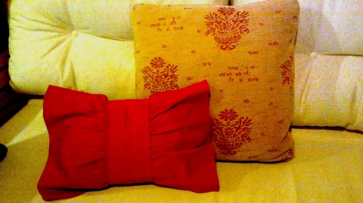Nämä ovat iloiset joulutyynymme, rusettityynyt(2 kpl) ostin pikkuisten vieraiden iloksi ja keltaiset laadukkaat (2 kpl) Kirkkoniemestä heräteostoksena korostamaan joululiinojen kultaista väriskaalaa.