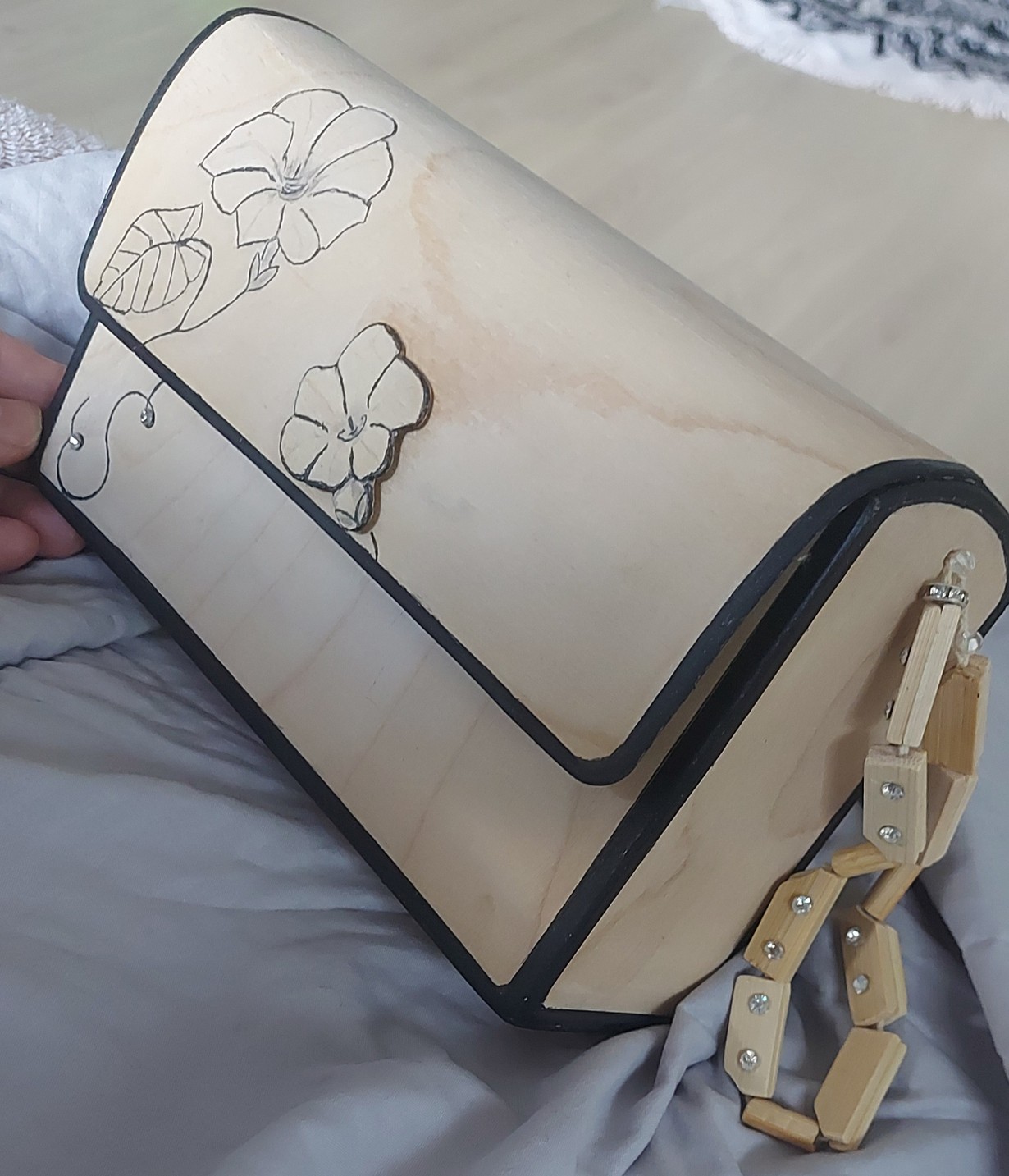 Iltalaukku jonka olen käsin tehnyt ohuesta vanerista. Vaneri taipuu kuuman silitysraudan avulla ja jäähtyessään jää melko hyvin taivutettuun asentoon. En maalannut tätä laukkua,sillä halusin tuon puupinnan näkyviin. Päällä on vain lakka ja vain laukun reunat on maalattu mustiksi. Päälle olen samasta vanerista tehnyt kukka koristeet. Myös upotin siihen muutamat lsikivet. Sisällä laukussa vuori,jotta laukkua on miellyttävämpi käyttää. Laukussa koristeellinen käsihihna Laukun sai lahjaksi Susanne Inne-Stubb.